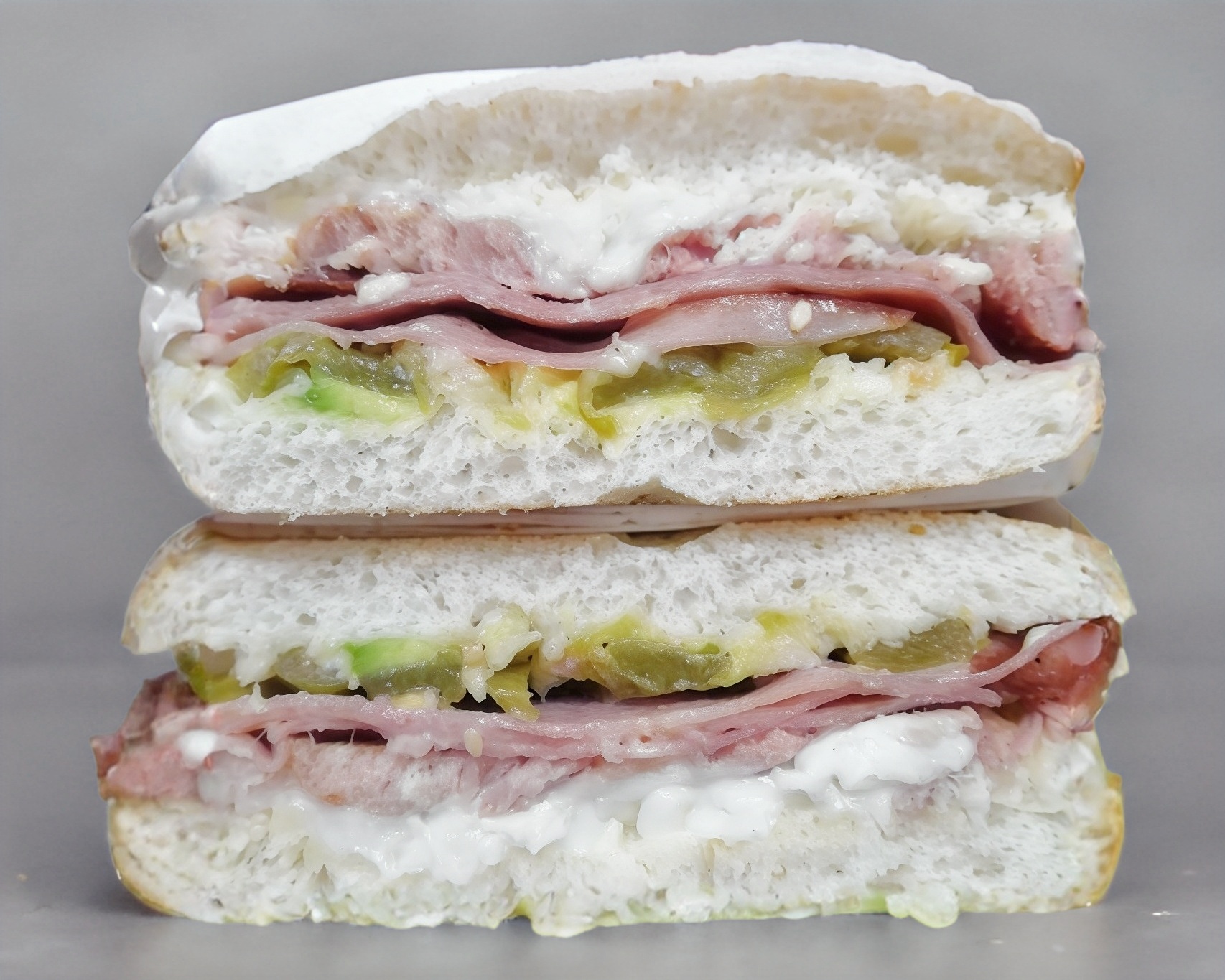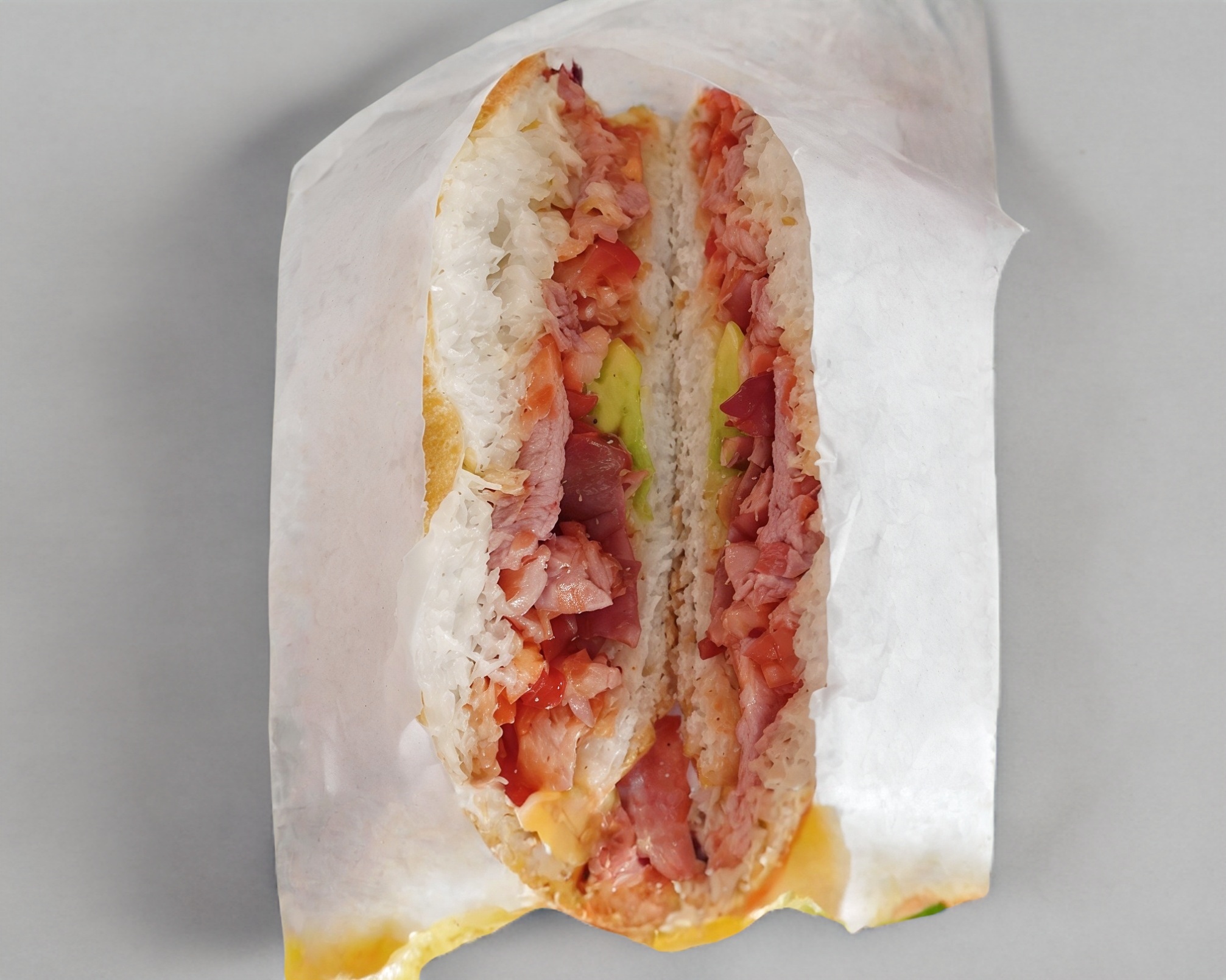 Telera doble con ajonjolí, pierna española, piña y quesillo.