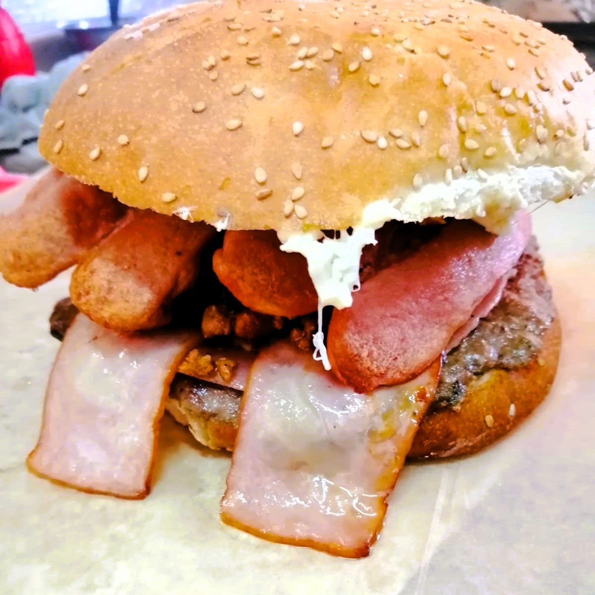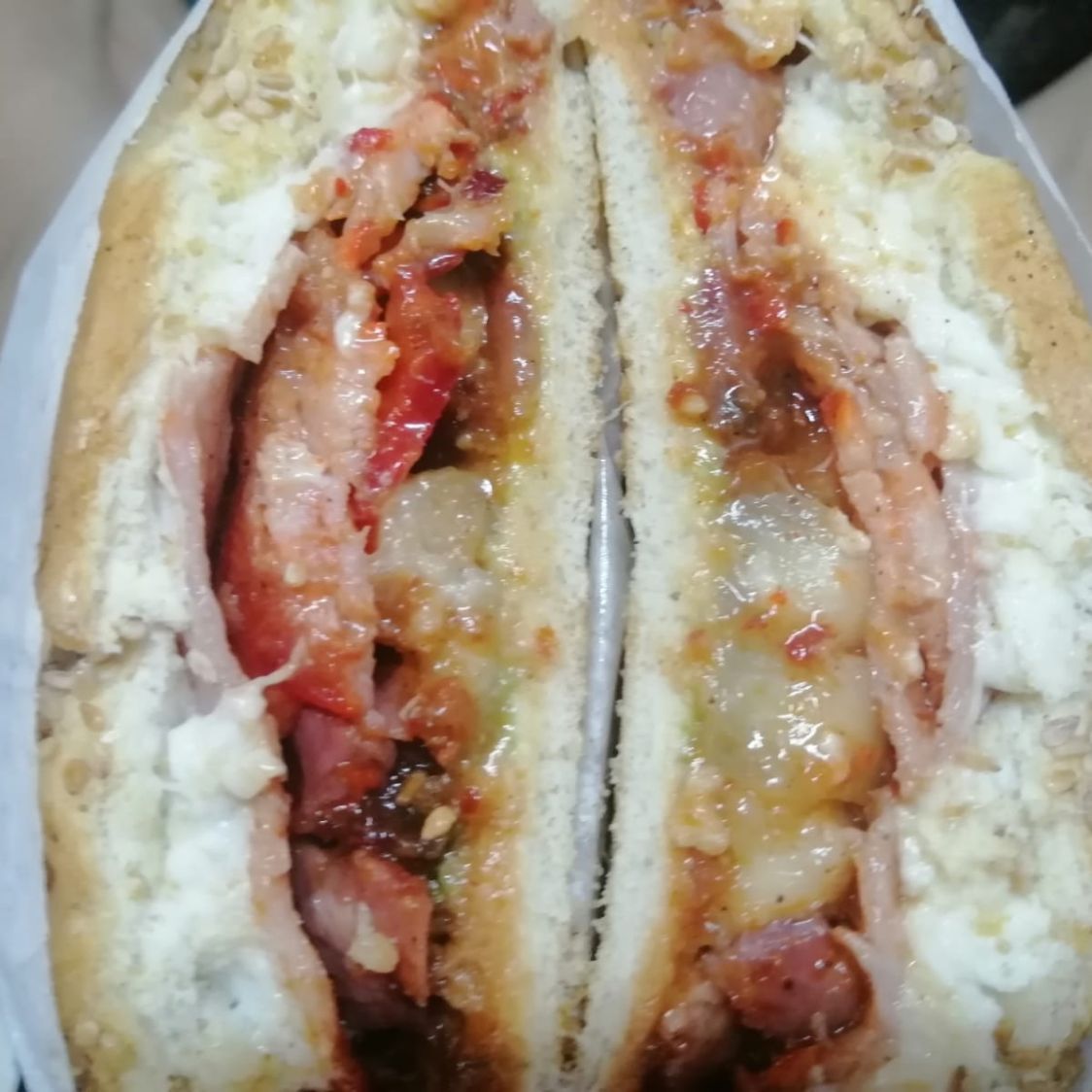 Telera doble con ajonjolí, Pierna española, 3 Salchichas y Quesillo