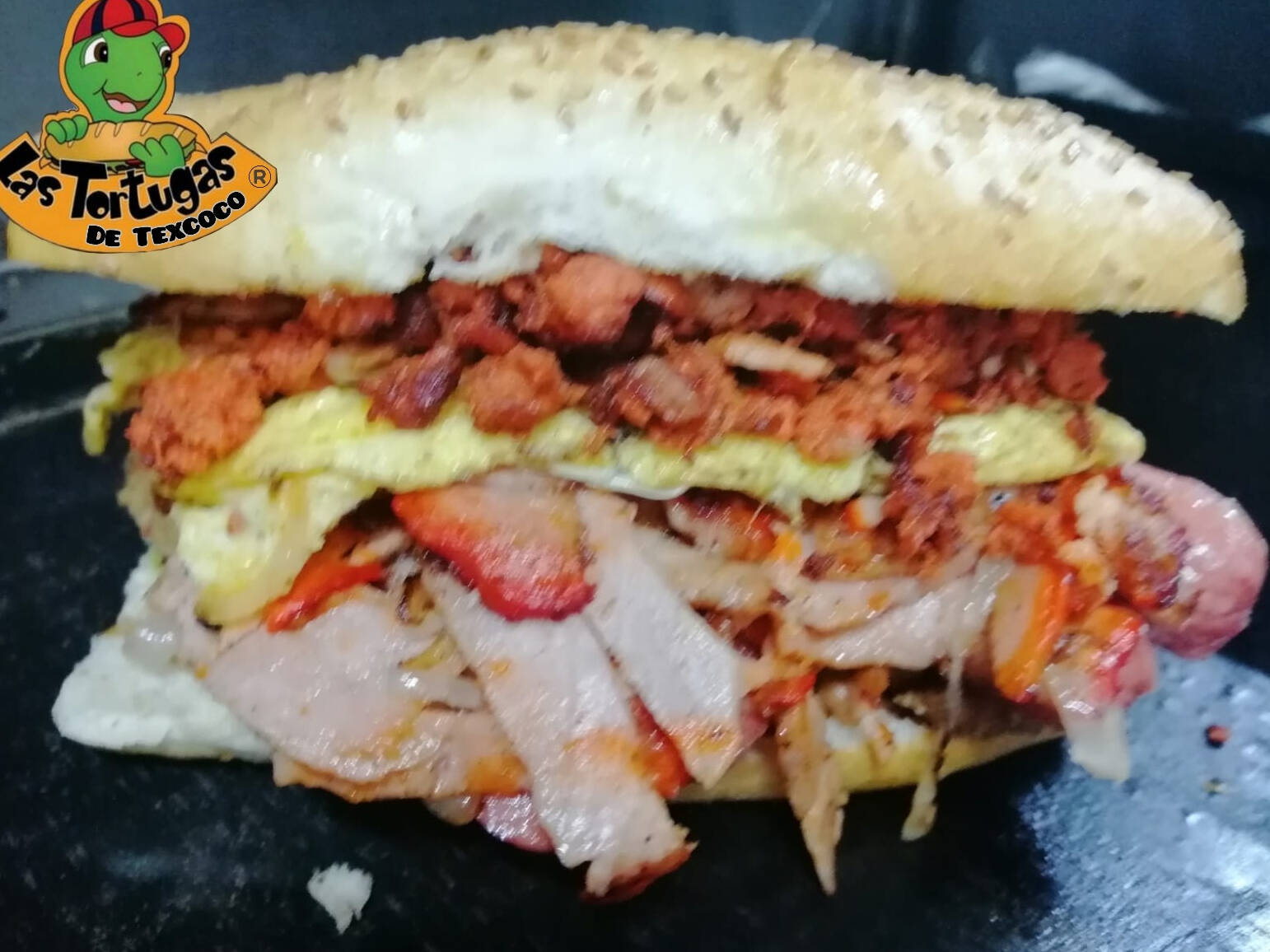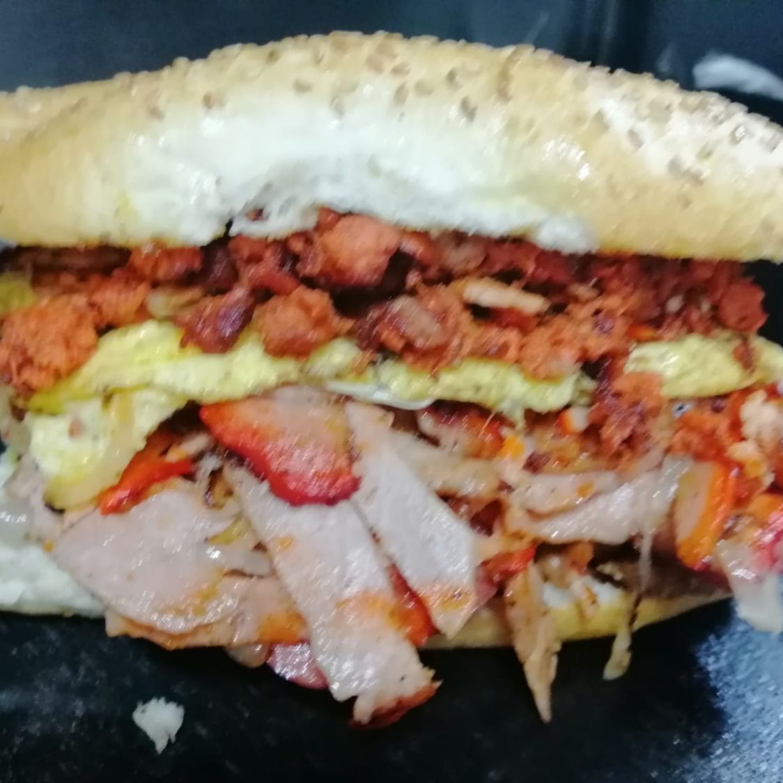 Telera doble con ajonjolí, Milanesa, Pierna española, 2 Salchichas, 2 Huevos, Chorizo y Quesillo