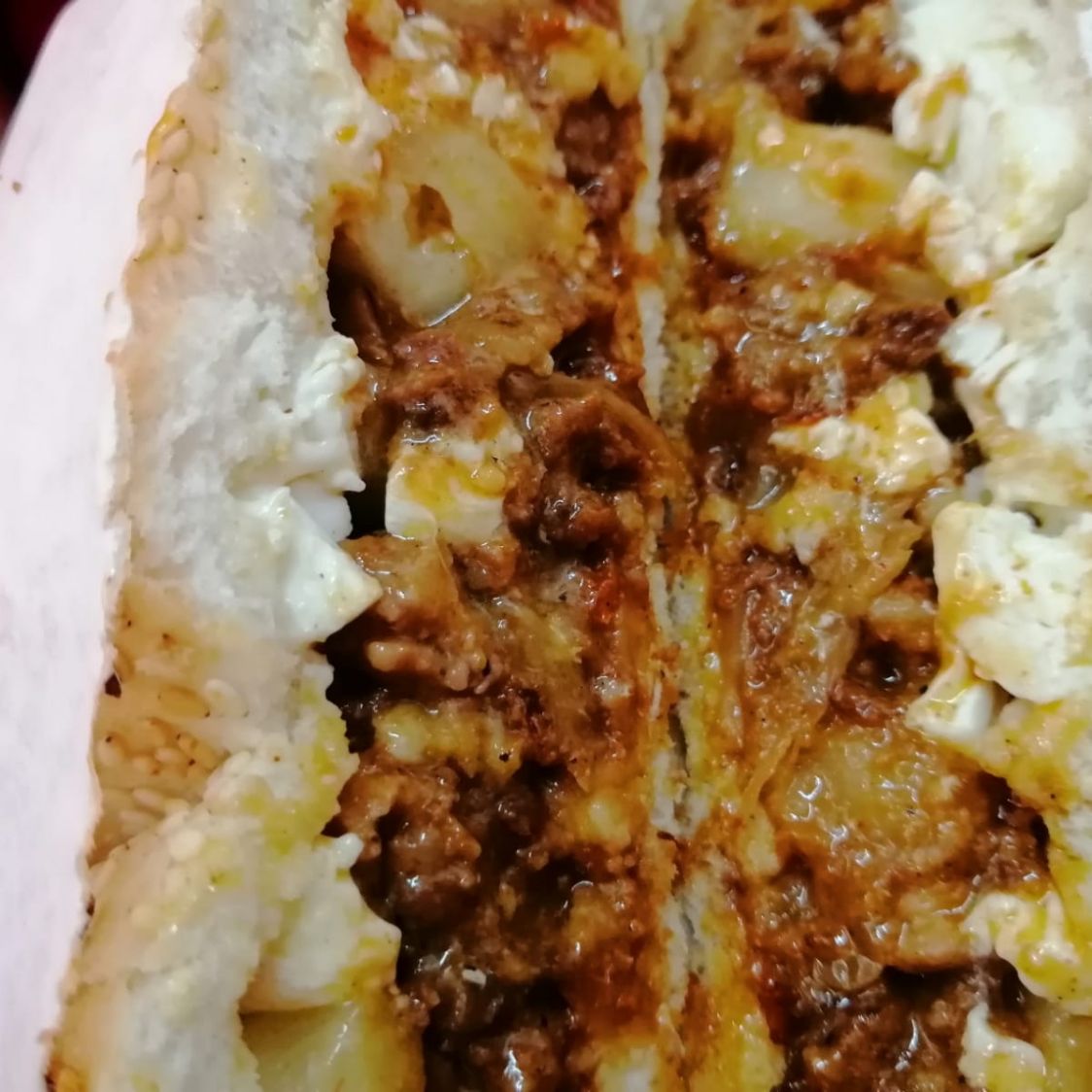 Telera doble con ajonjolí, Carne al Pastor y Quesillo