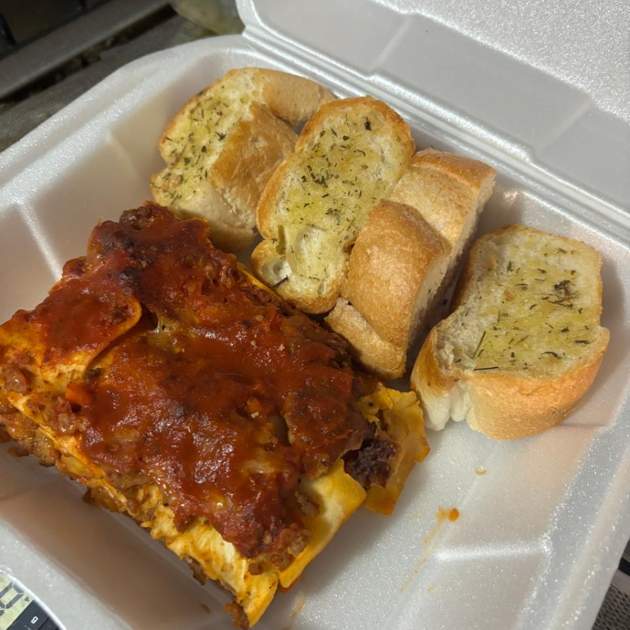 Lasaña de res y puerco, queso mozarella machego e ingredientes frescos. Acompañada de pan de ajo con especias italianas