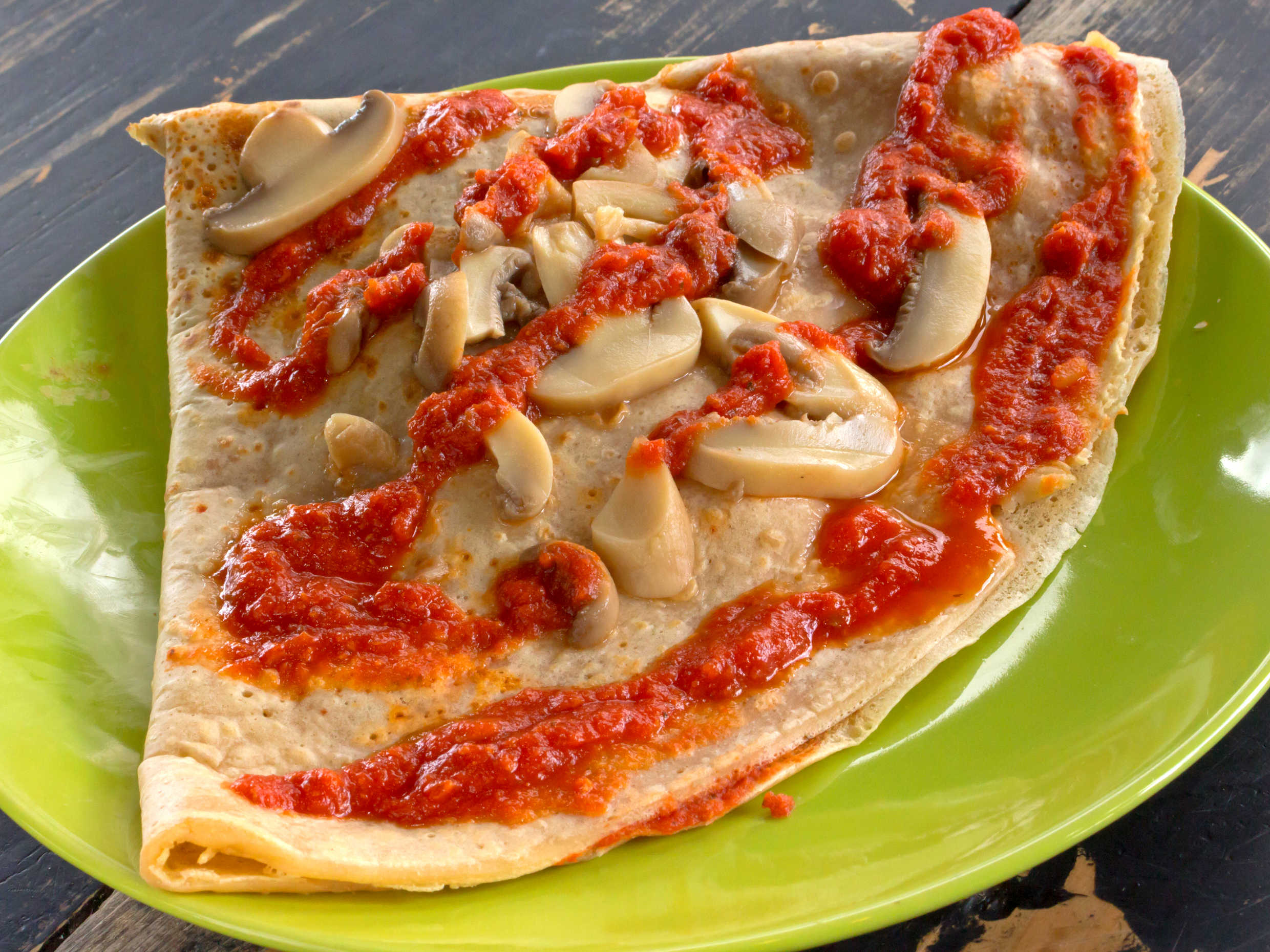 Masa delgada para crepas, salsa para pizza y diferentes ingredientes.