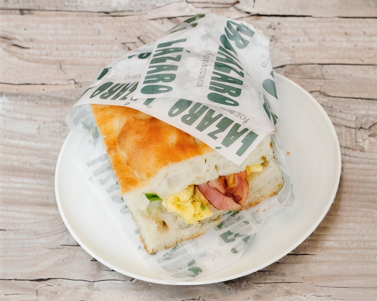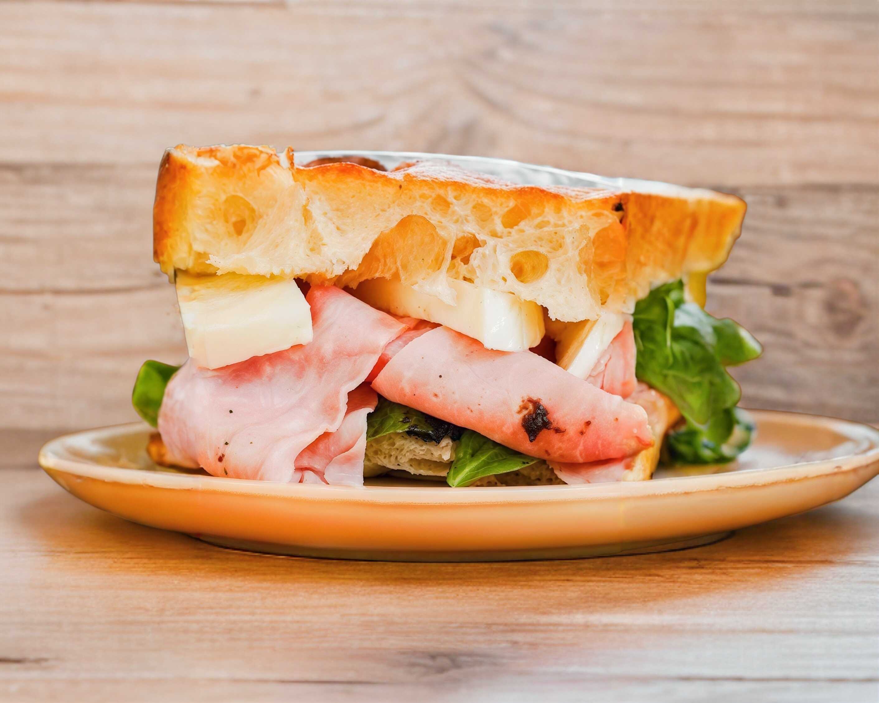 Jamón york, tapenade de aceituna negra, mozzarella fresca, corazones de alcachofa, albahaca fresca y aceite de trufa.