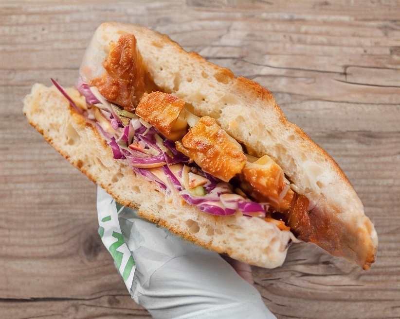 Pollo empanizado, ensalada de col, cilantro, mayonesa de chipotle y queso chihuahua fundido.