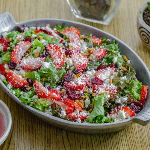 Variedad de lechugas, fresa, arándano, queso feta, semilla de girasol caramelizada. Las ensaladas están perfectamente desinfectadas y van acompañadas por un delicioso aderezo preparado en casa, con ingredientes de primera calidad.
