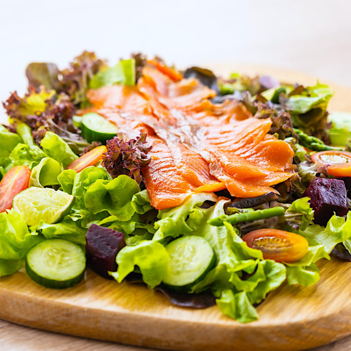 Variedad de lechugas, salmón ahumado, jitomate cherry, alcaparras, cebolla morada, queso crema y almendras. Las ensaladas están perfectamente desinfectadas y van acompañadas por un delicioso aderezo preparado en casa, con ingredientes de primera calidad.