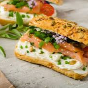 Escoge entre; baguette, chapata, bagel o pan árabe. Salmón noruego, queso crema y alcaparras. Se sirve de acuerdo a su receta, acompañados por lechuga, jitomate, cebolla morada o aguacate y aderezos para realzar su sabor.