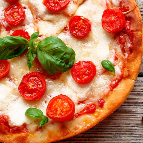 Salsa italiana, queso mozzarella, jitomate fresco y albahaca. Pizza de 30 cm de diámetro, 8 rebanadas.