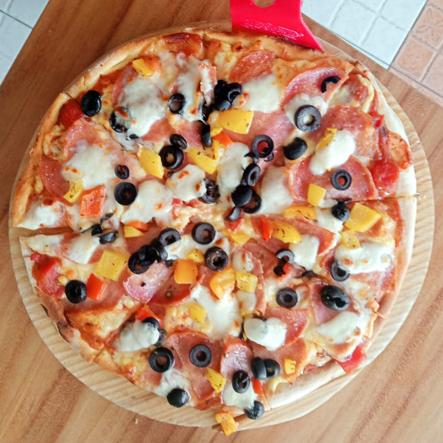 Salsa italiana, queso mozzarella, salami, queso mozzarella fresco, aceitunas negras, jitomate deshidratado y pimientos asados. Pizza de 30 cm de diámetro, 8 rebanadas.