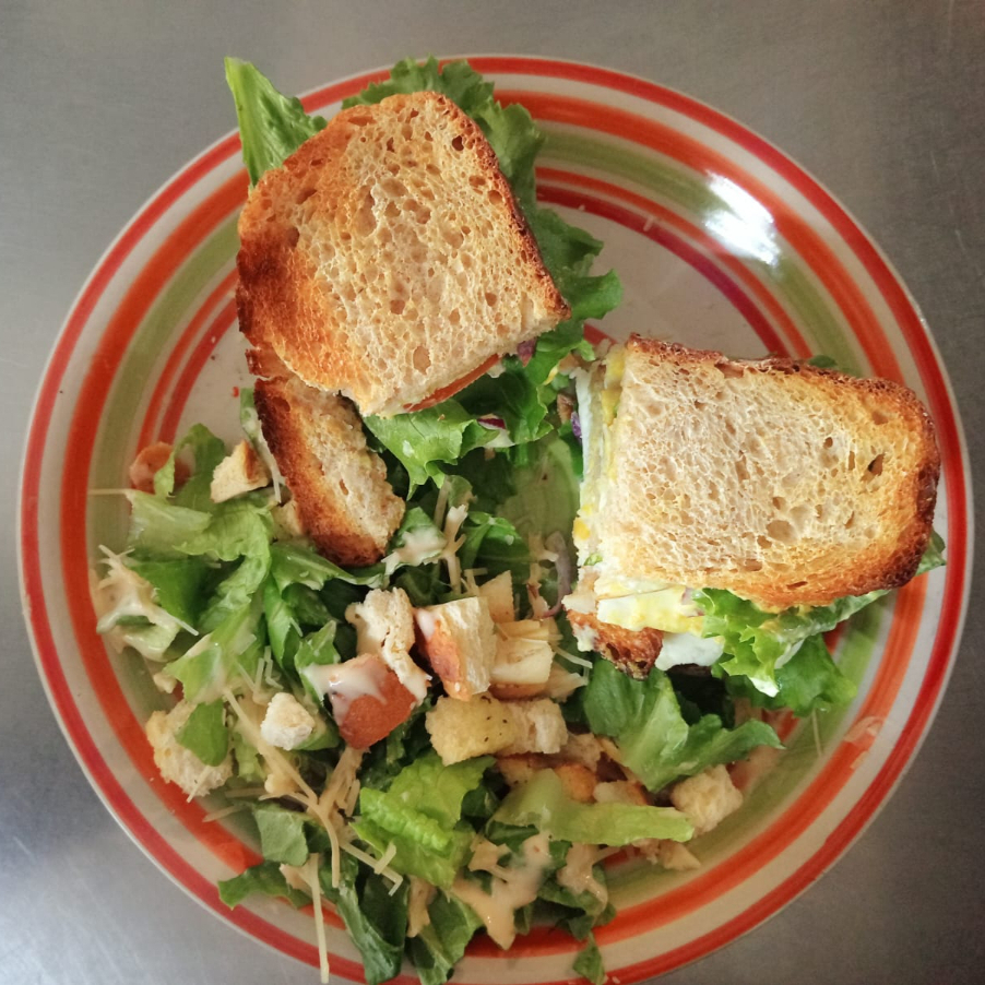 Ensalada césar, medio baguette de jamón, queso gouda y agua del día.
