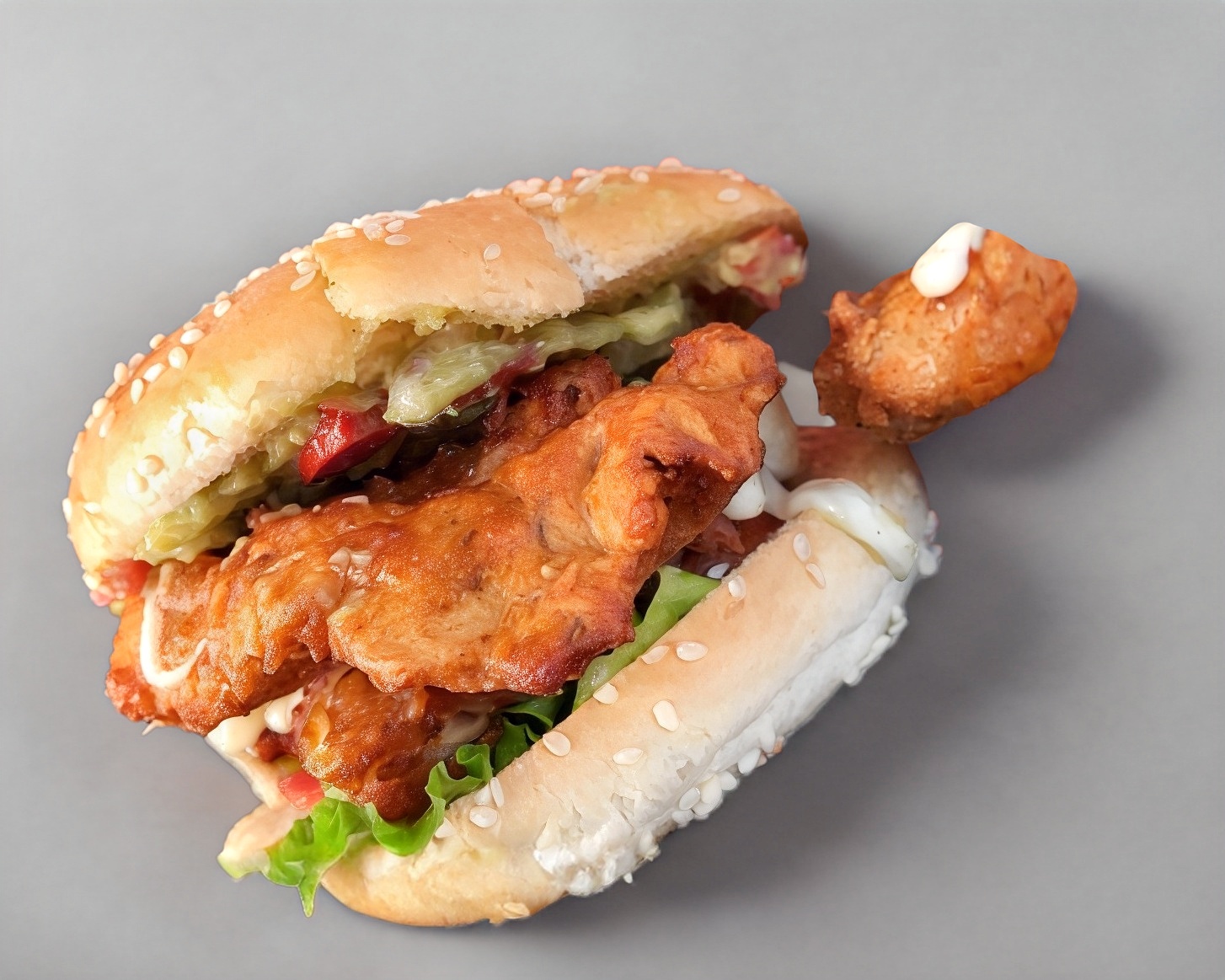 Hamburguesa de pollo empanizada, tocino, salsa BBQ, queso Oaxaca, en el pan mayonesa, jitomate yl echuga