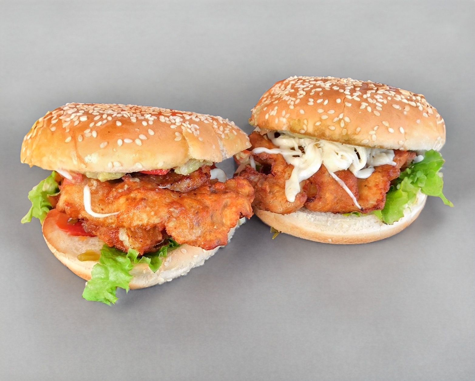 Hamburguesa de pollo empanizada, gratinada con queso Oaxaca,en el pan, mayonesa, jitomate, lechuga y picante