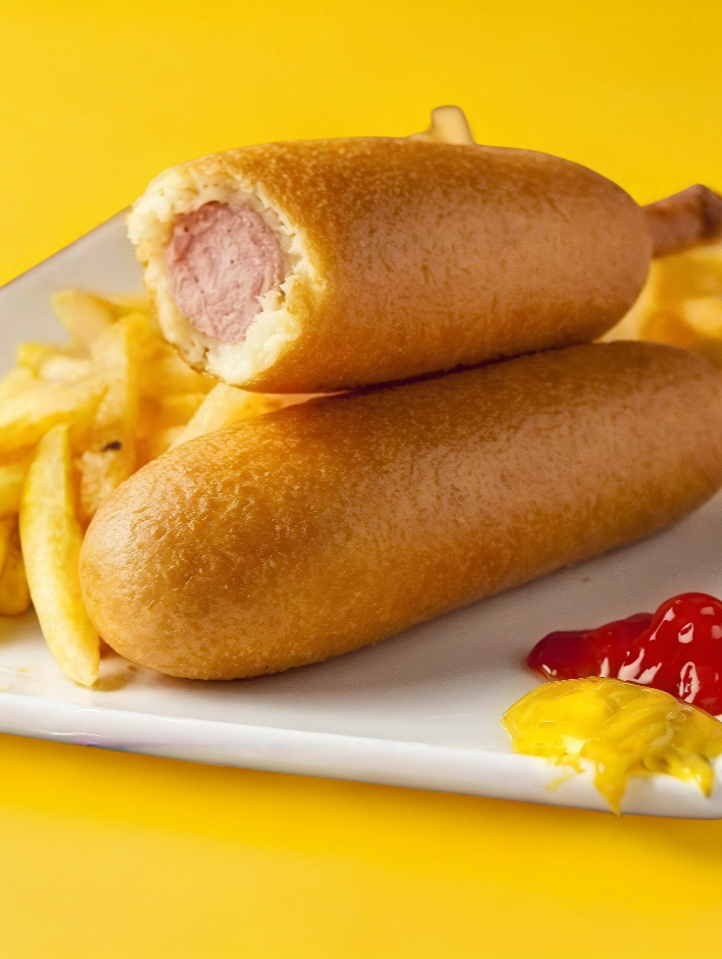 4 pzs de salchichas cubiertas c/harina de la casa ,mayonesa,queso tipo nacho,catsup