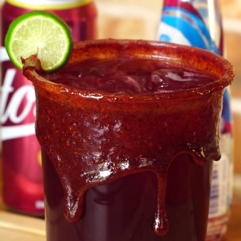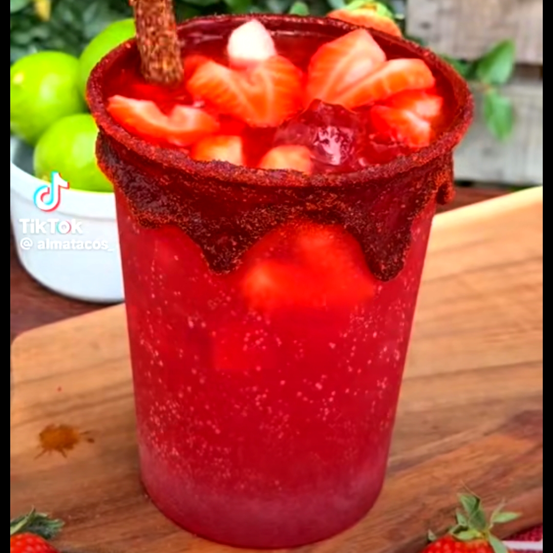 bebida con vodka, refresco citrico, hielo, escarchado con chamoy de fresa y miguelito de sabor fresa decorado con cerezas y gomitas