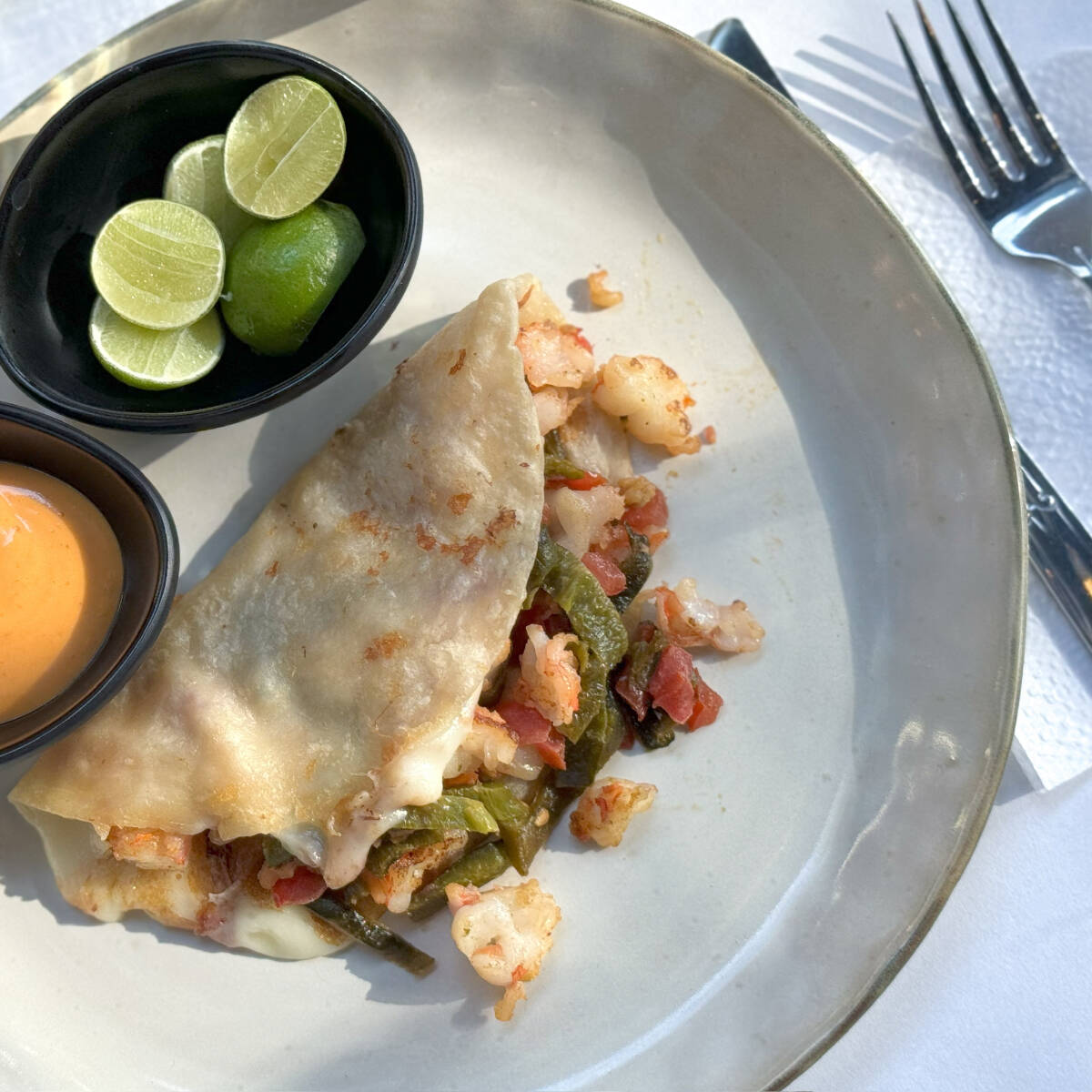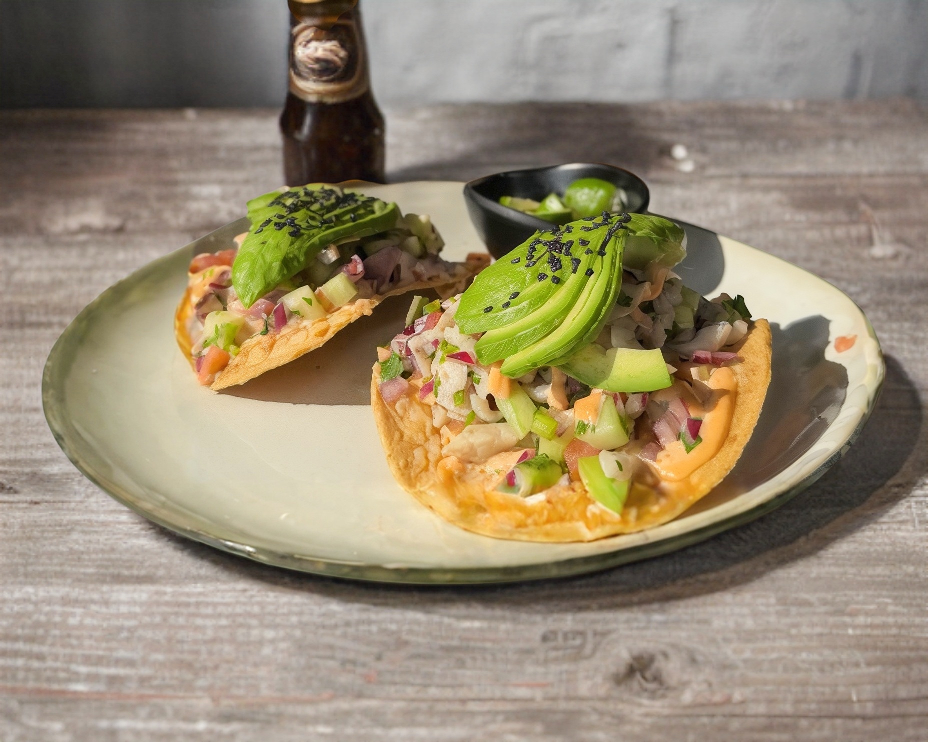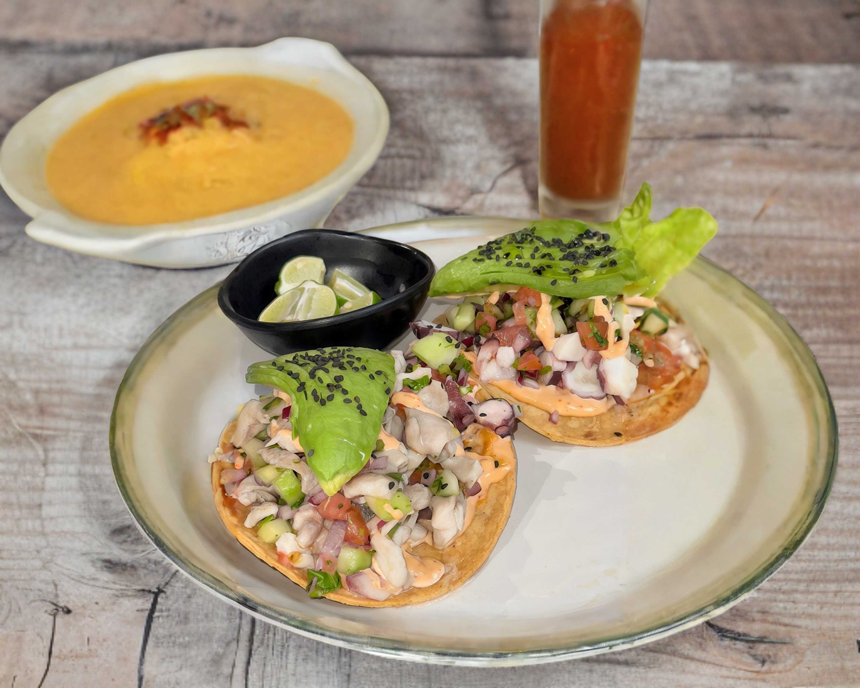 Tostada de camaron con verduras y dip de la casa