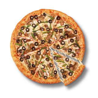 pizza grande de champiñones, cebolla, pimiento verde y aceitunas negras con la orilla rellena de queso mozzarella y sazonada con mantequilla de ajo y parmesano