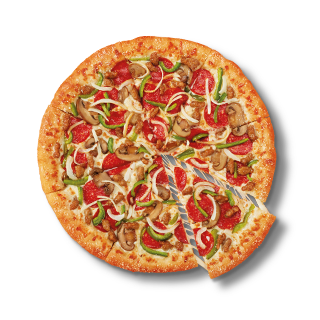 Pizza grande redonda de pepperoni, salchicha italiana, champiñones, cebolla y pimiento verde