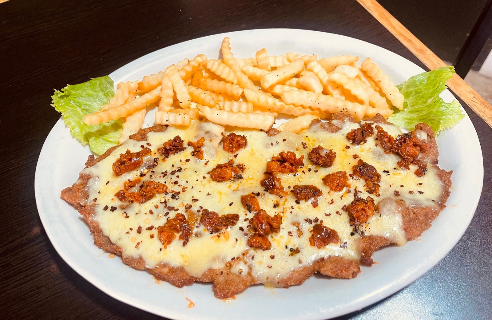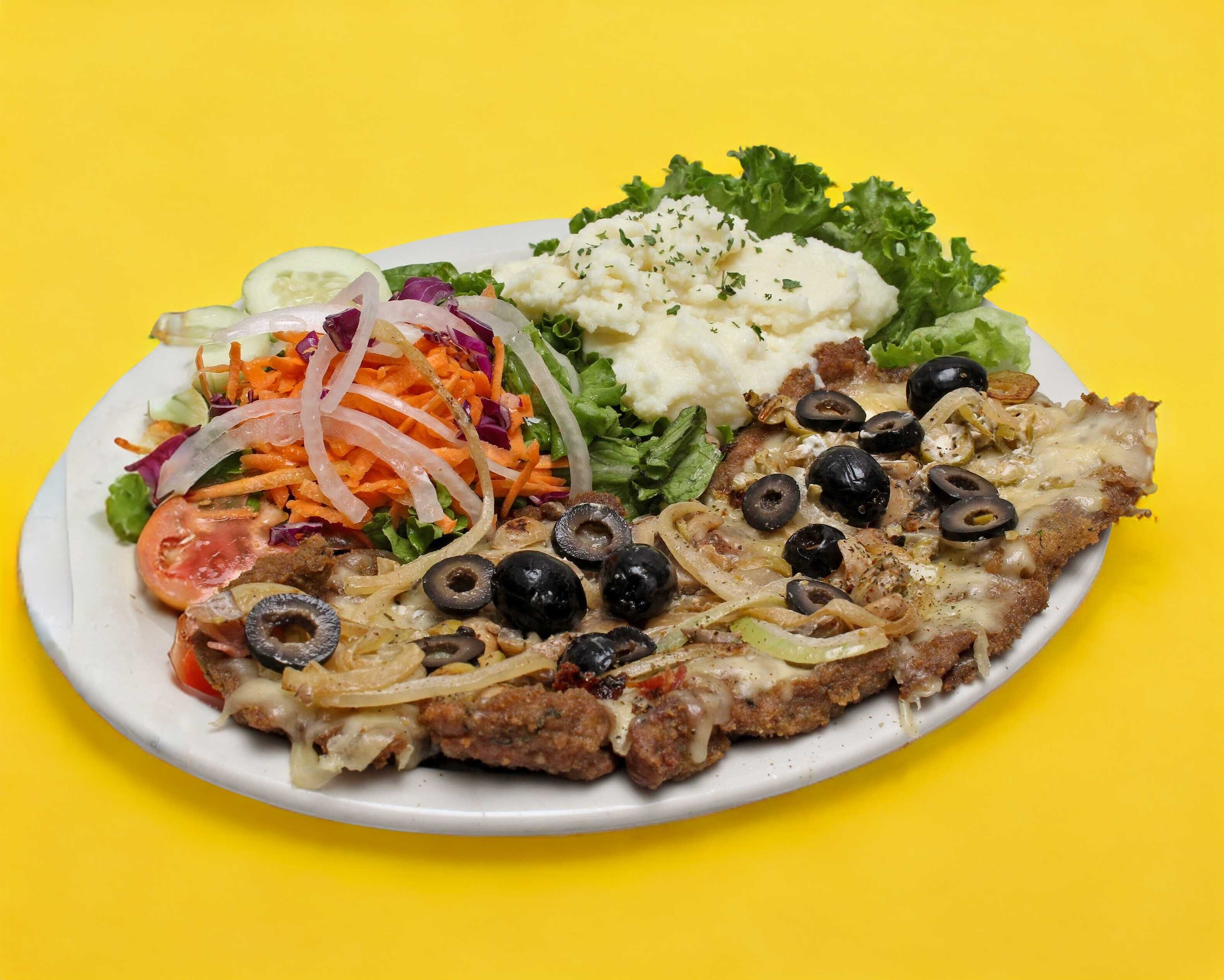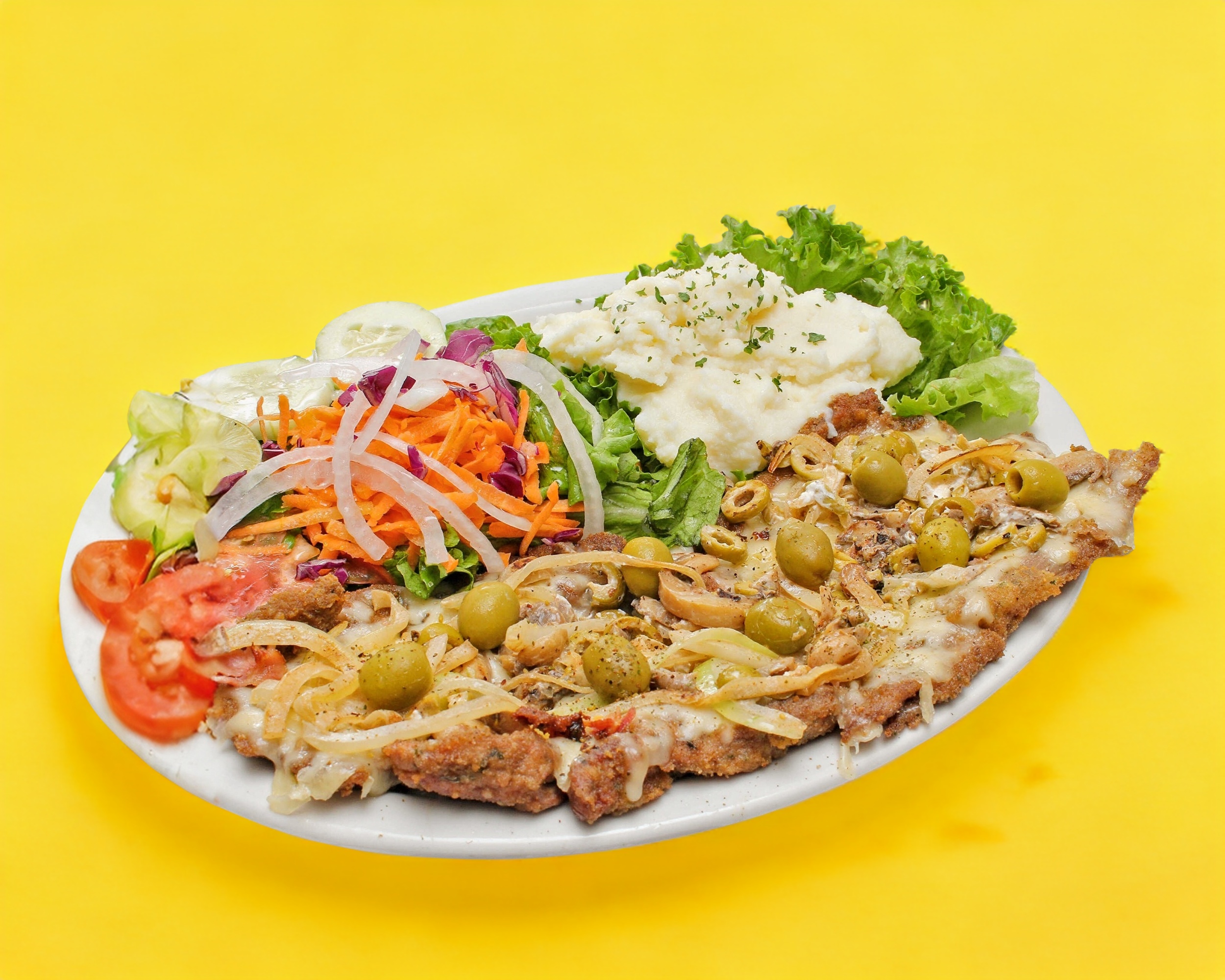 Mozarella, champiñones , queso crema, cebolla frita y aceitunas verdes.