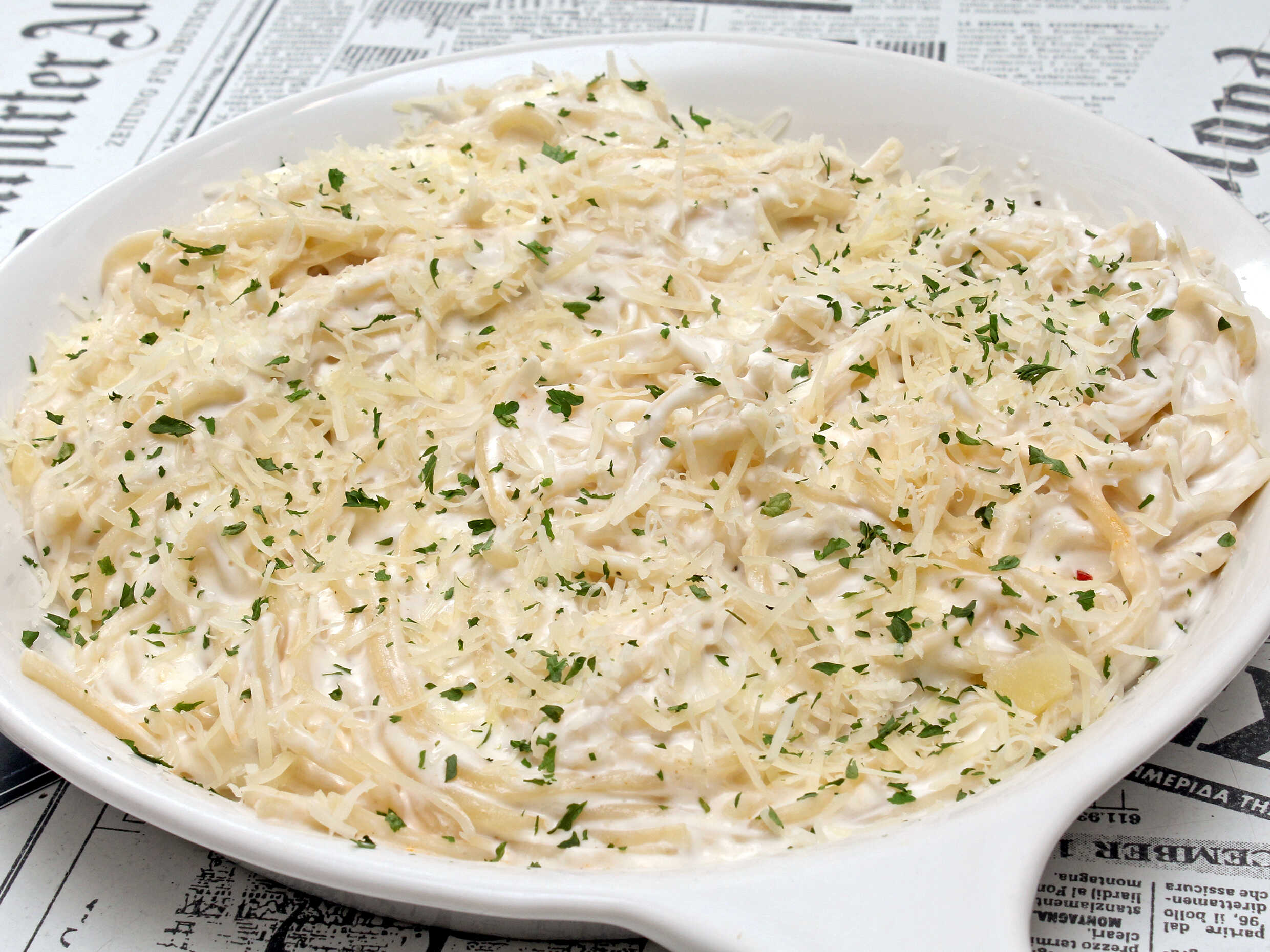 Pasta a la crema con trocitos de tocino y queso parmesano.