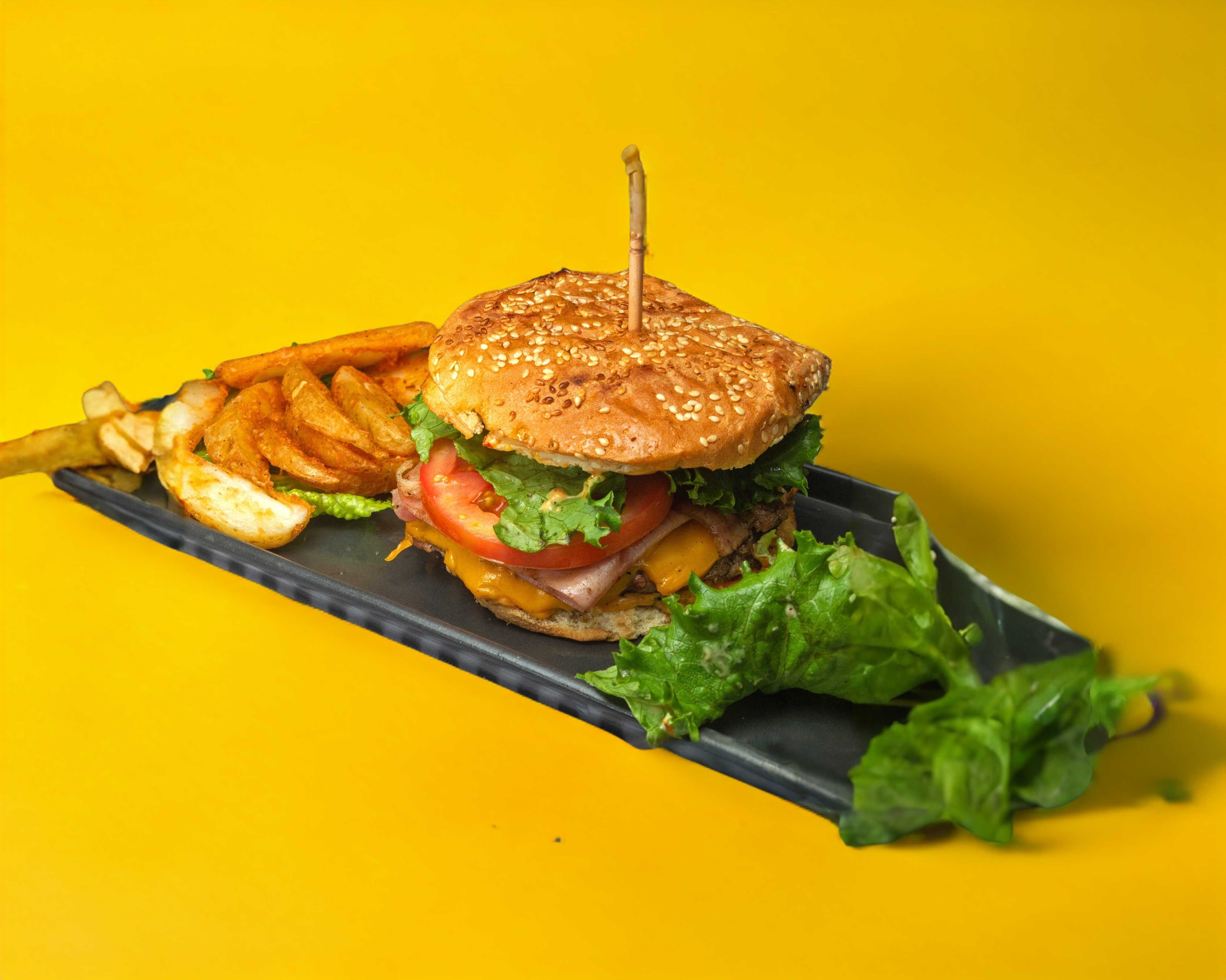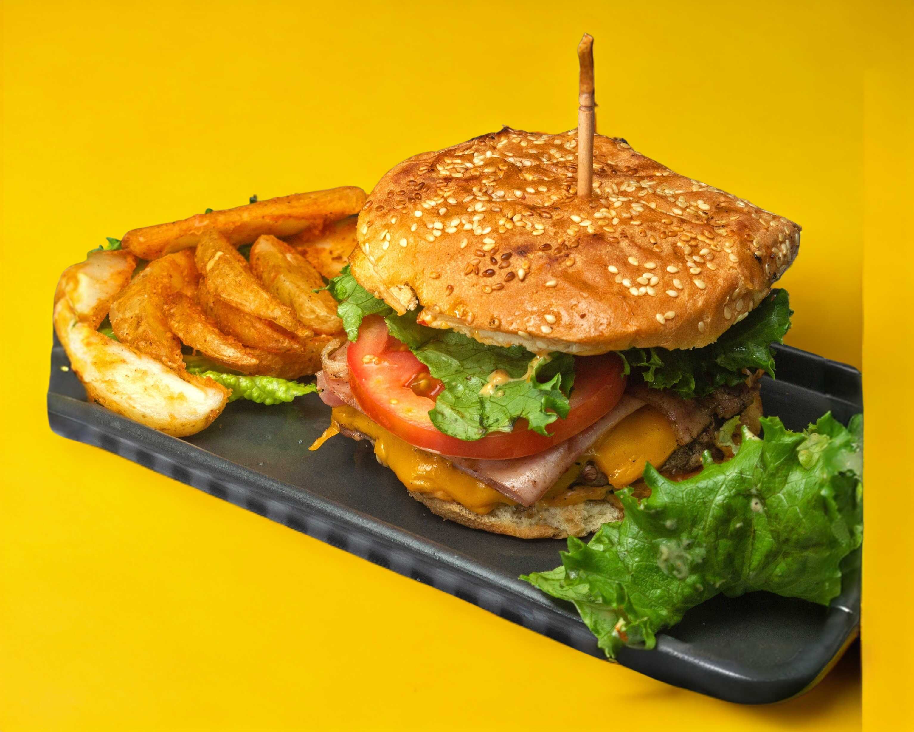 Carne de res con queso amarillo americano, tocino, lechuga, jitomate y aderezo de catsup, mostaza y mayonesa.