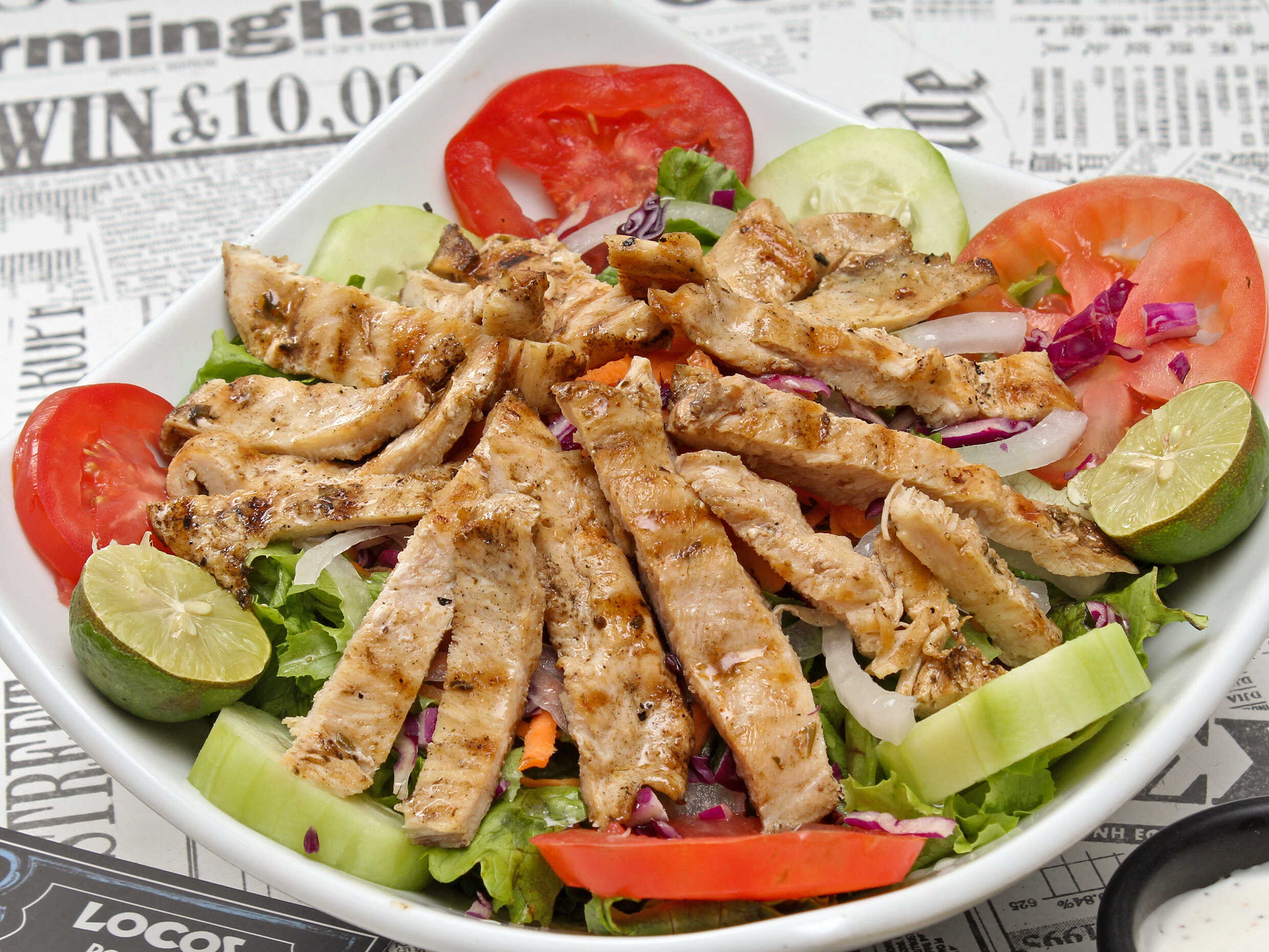 Base de ensalada mixta, con tiras de pollo a la parrilla.