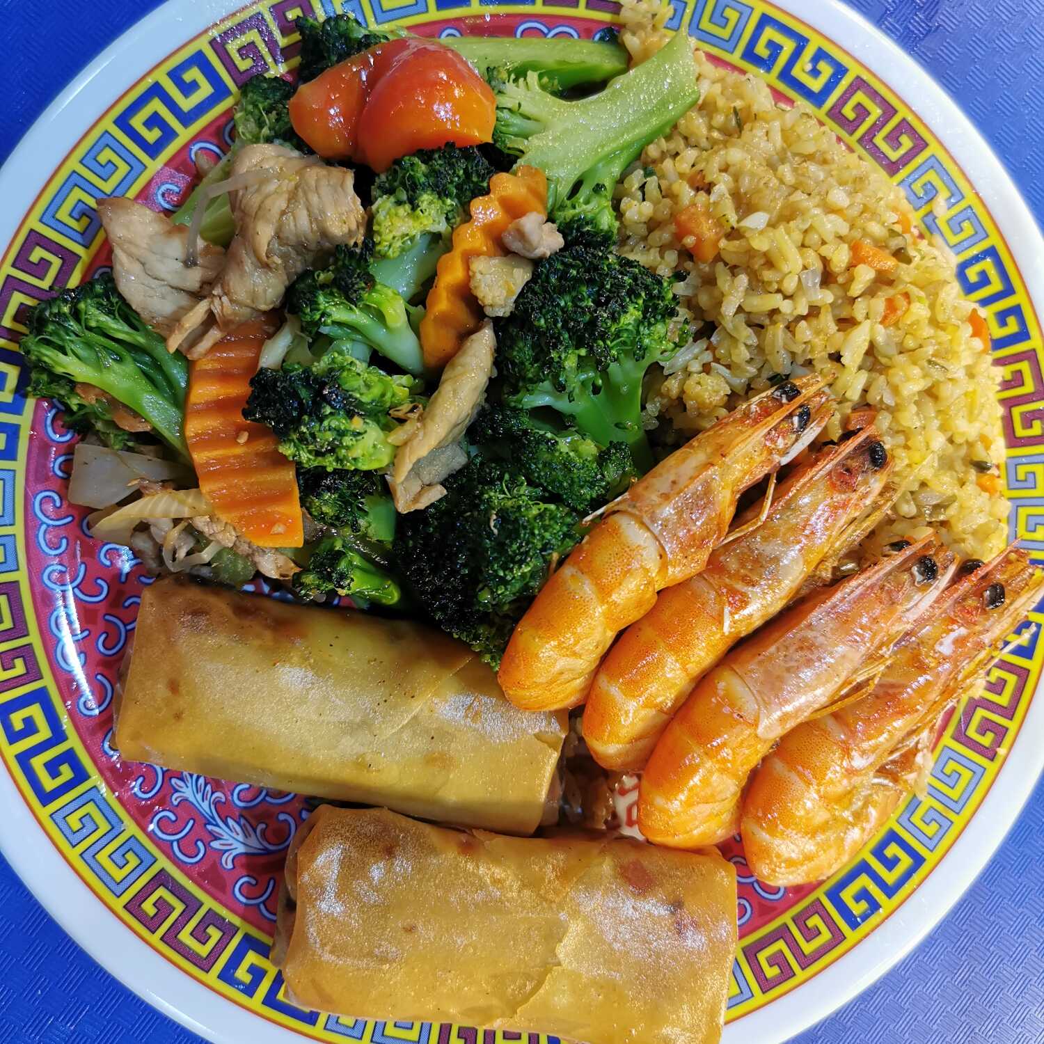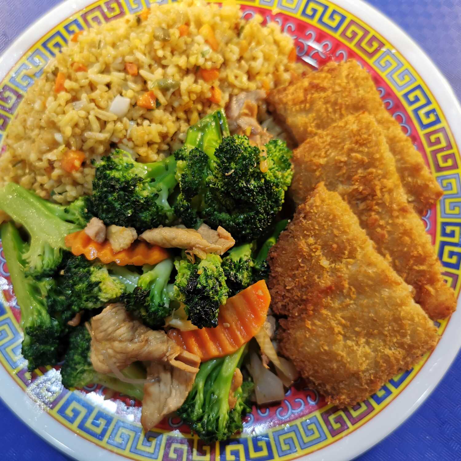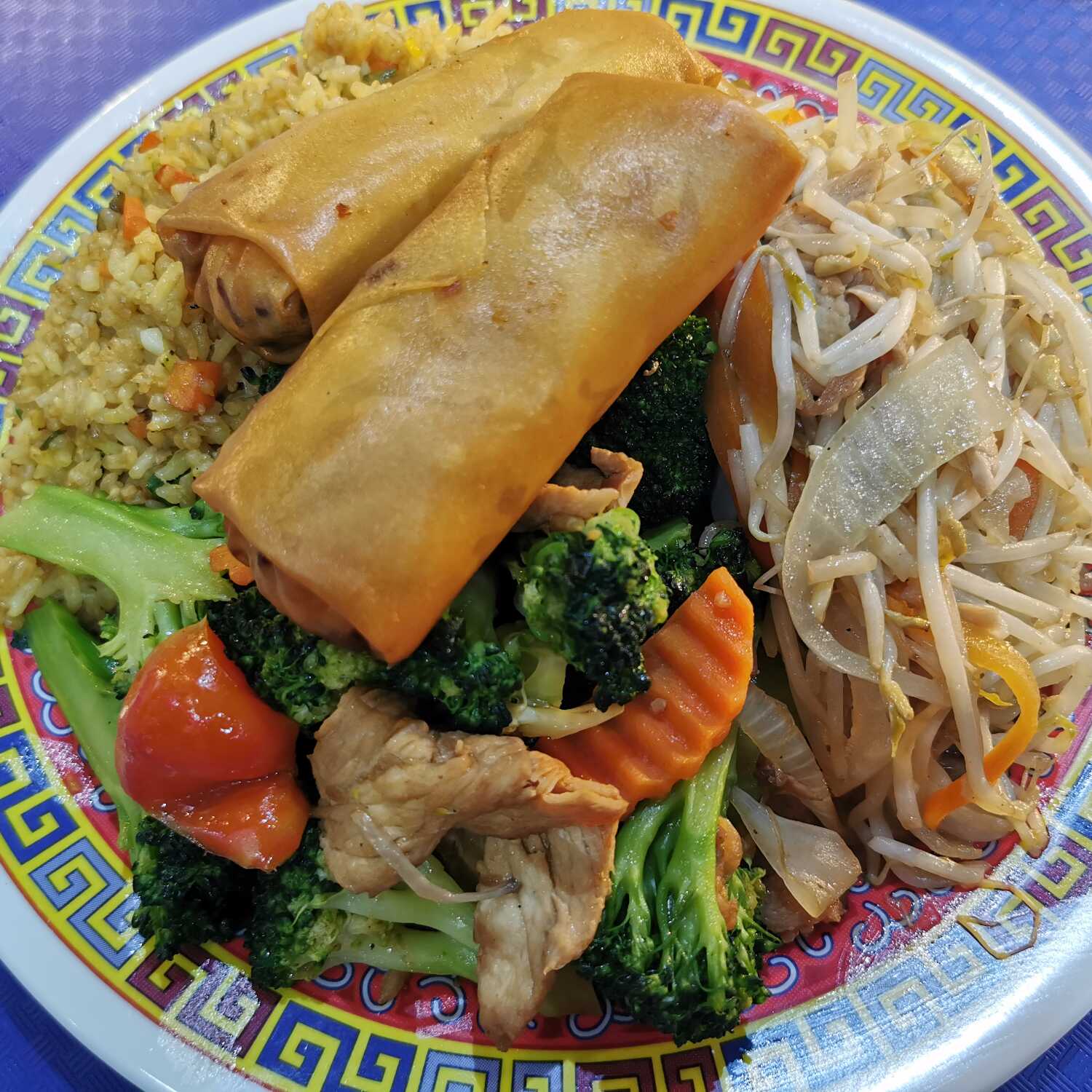 Arroz mixto o espaguetis, con chop suey mixto, bistec de res con brócoli y rollo primavera.