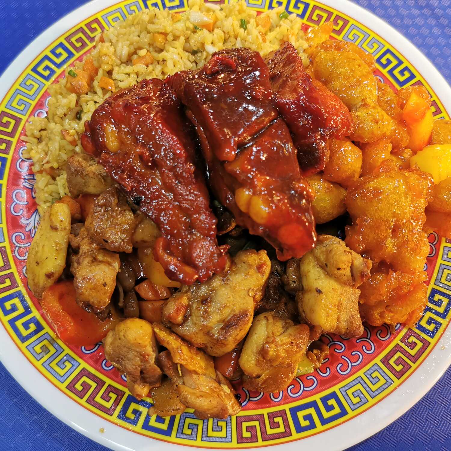Arroz mixto o espaguetis, con costilla BBQ y pollo diablo y pollo agridulce.