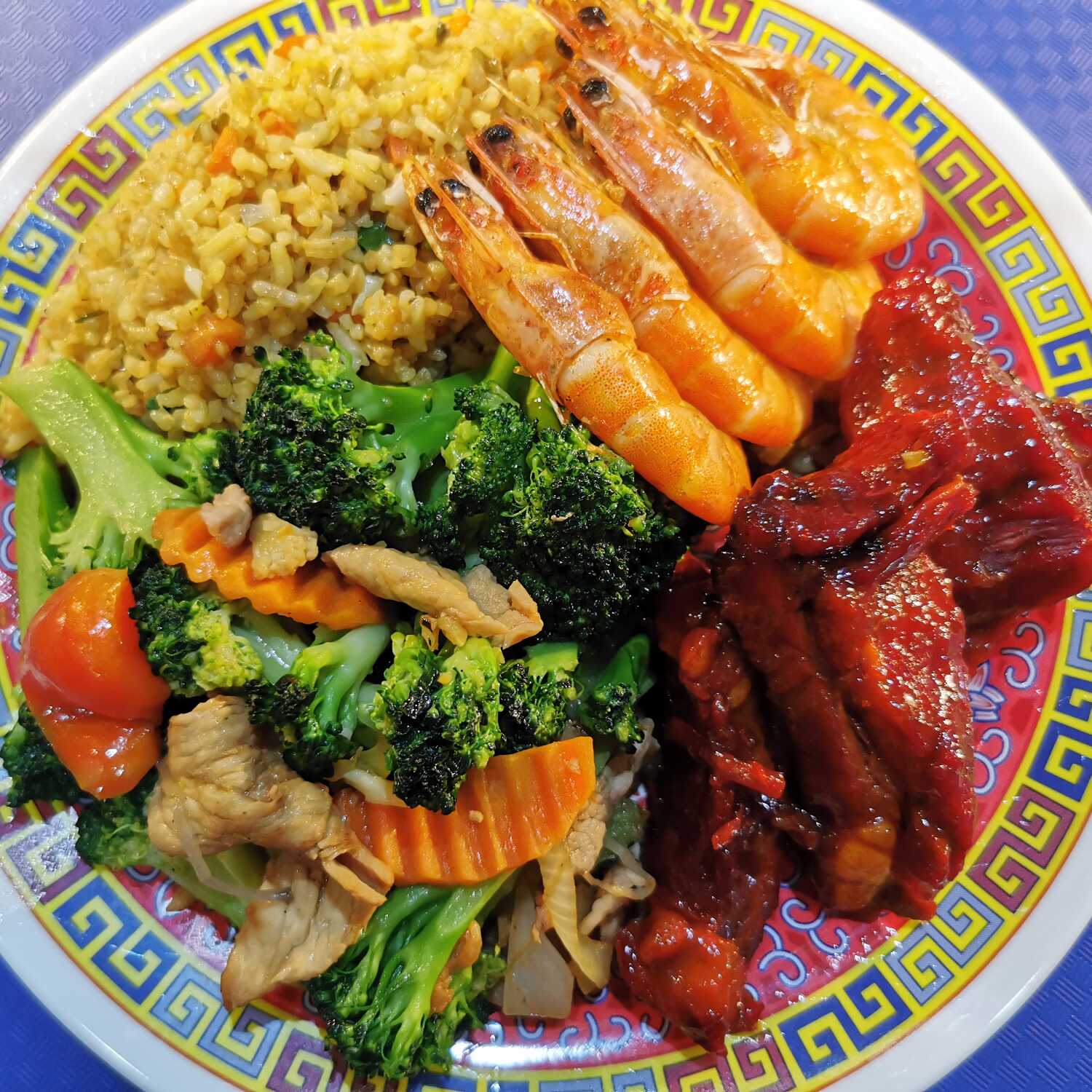 Arroz frito o espaguetis, con camarón enchilado, costilla BBQ y bistec de res con brócoli.