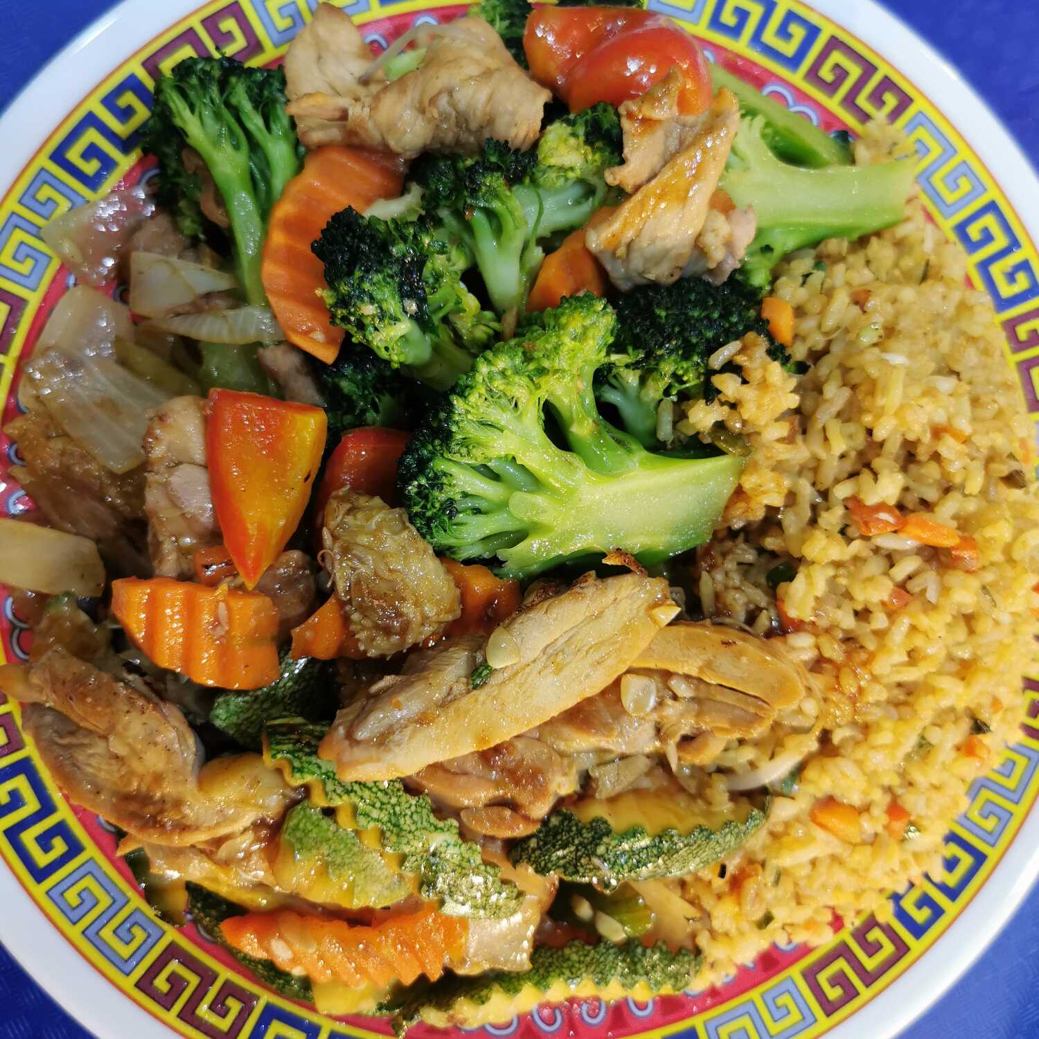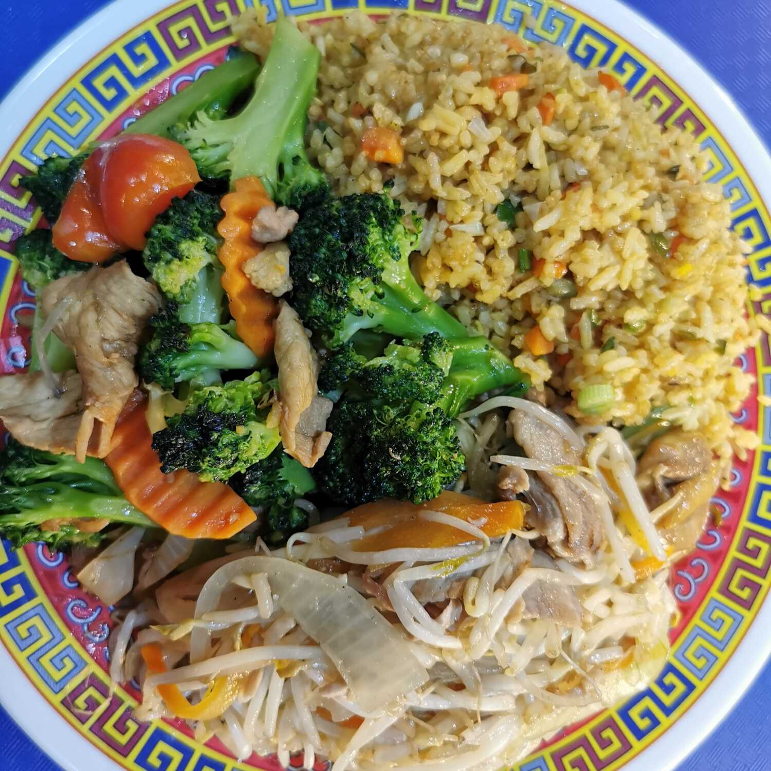 Arroz frito o espaguetis, con pollo a la plancha y bistec de res con brócoli.