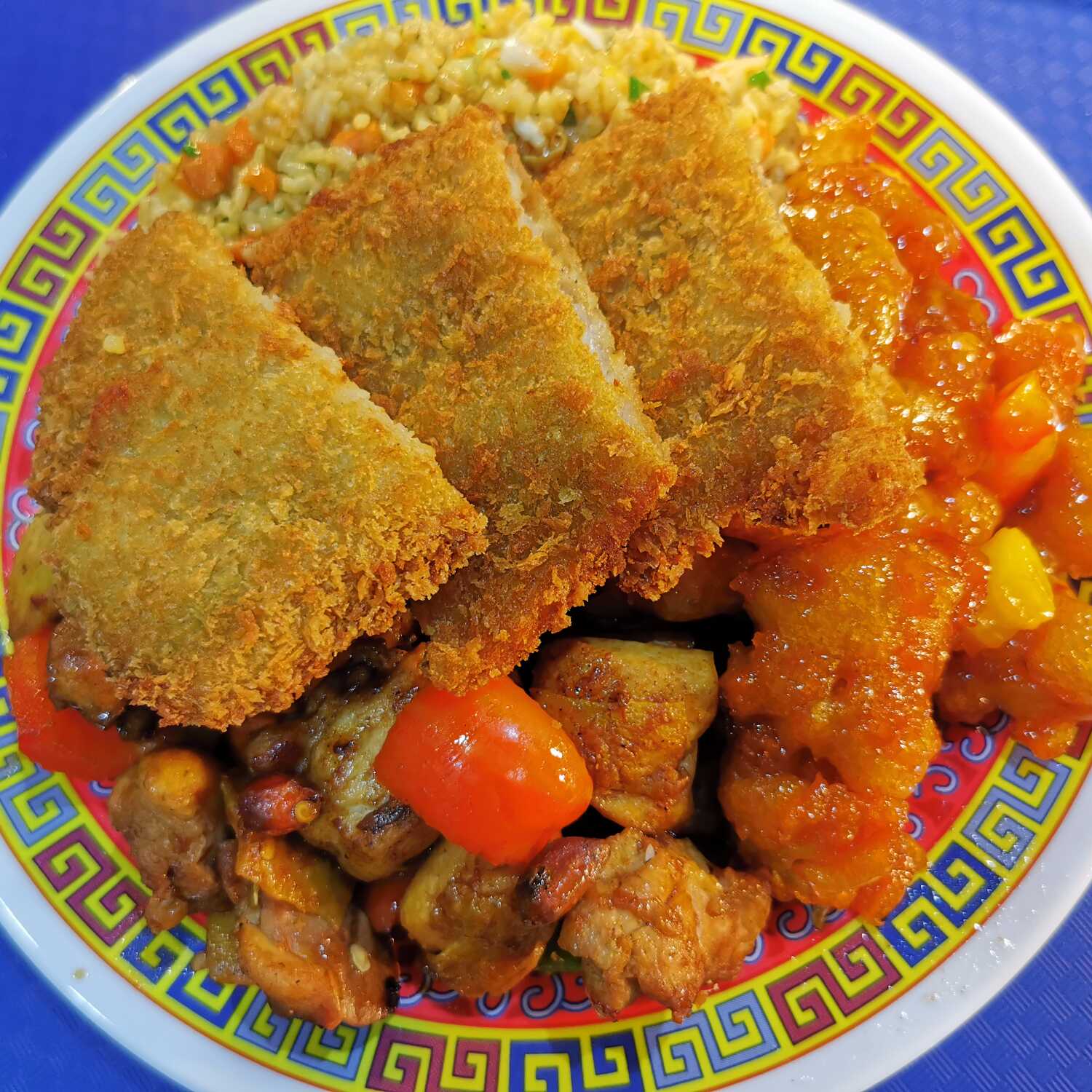 Arroz mixto o espaguetis, con pollo diablo y pollo agridulce y pescado empanizado.