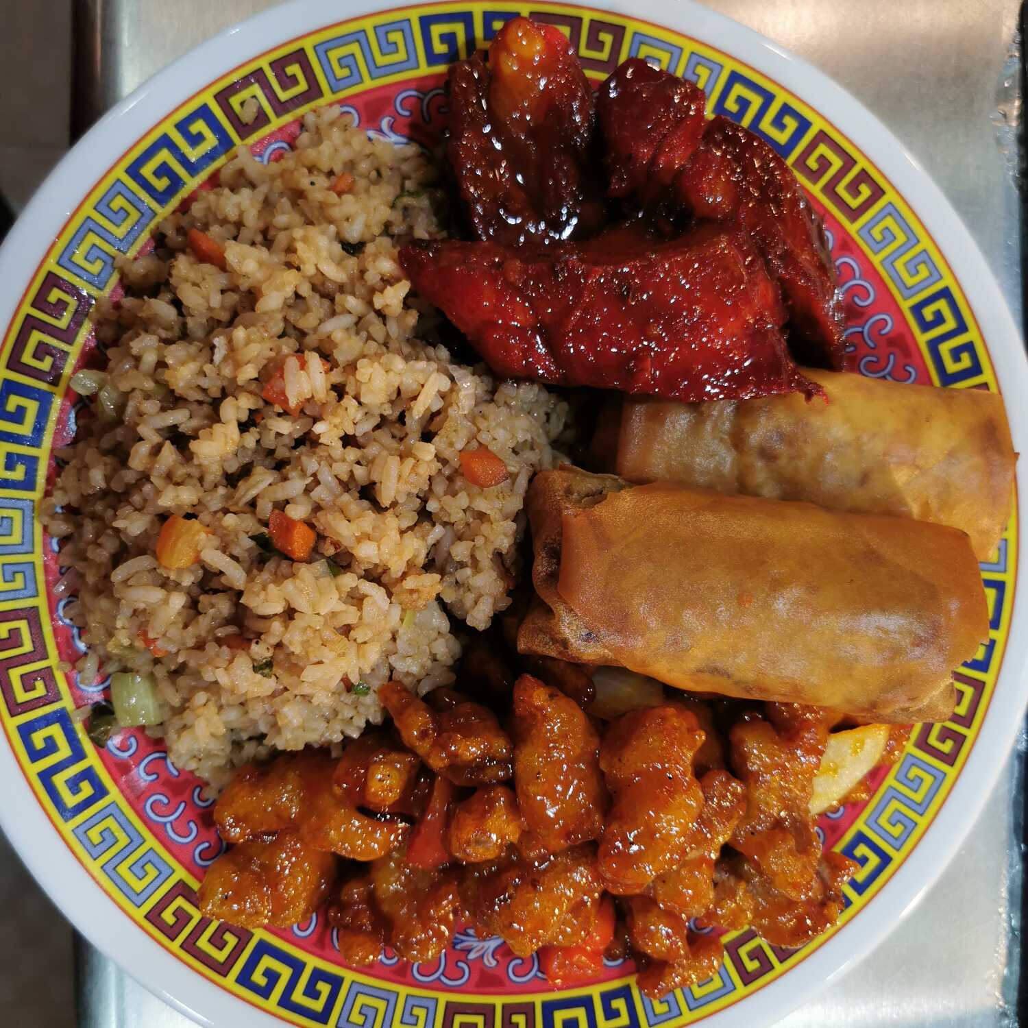 Arroz mixto o espaguetis, con pollo agridulce, rollo primavera y costilla BBQ.