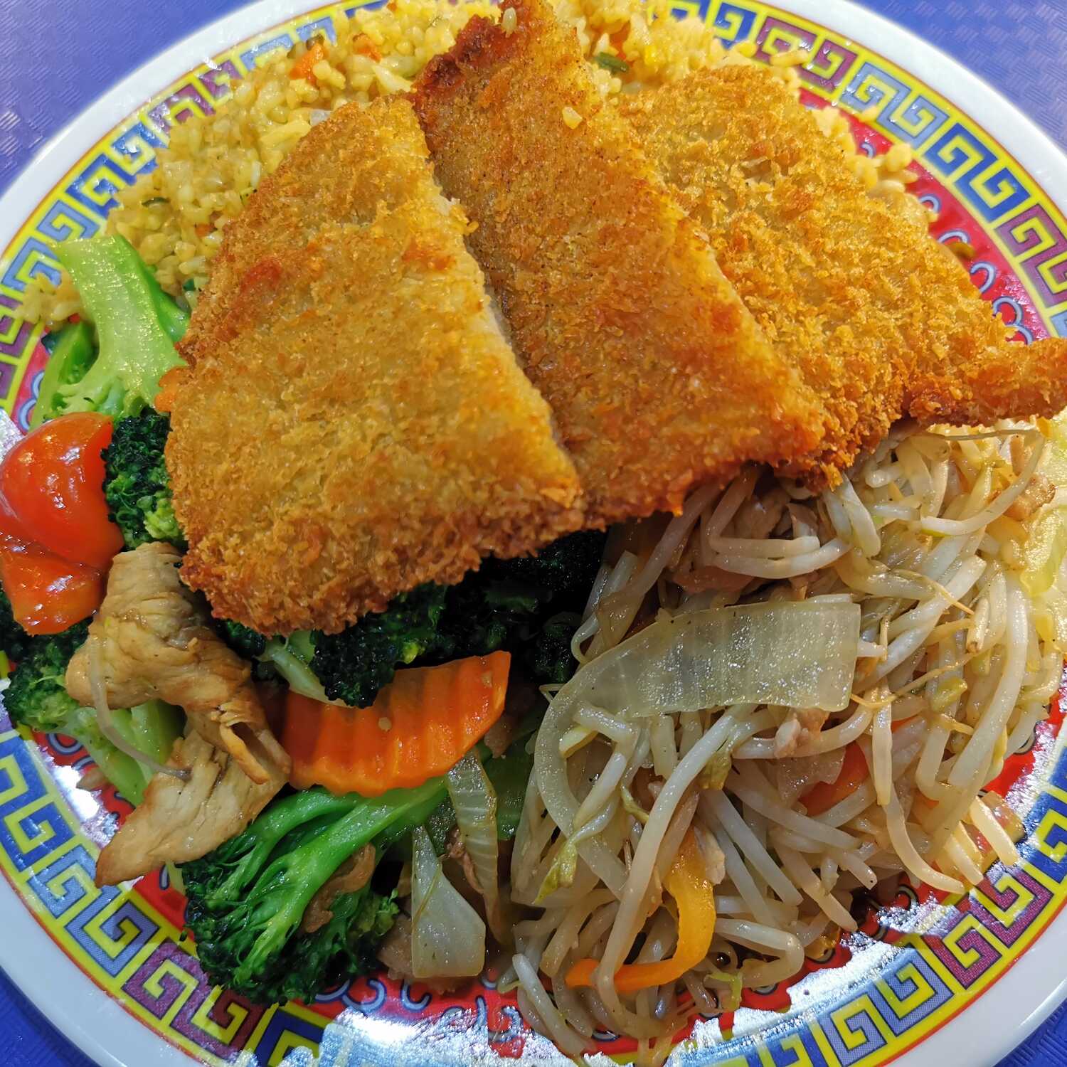 Arroz mixto o espaguetis con pescado empanizado, chop suey mixto y bistec de res con brócoli.