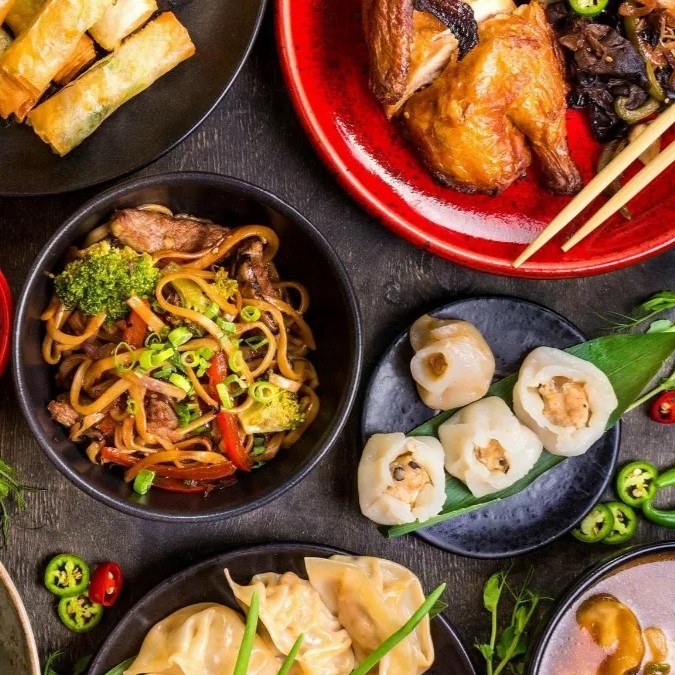 Arroz mixto o espaguetis, con pollo cantones y pollo agridulce.