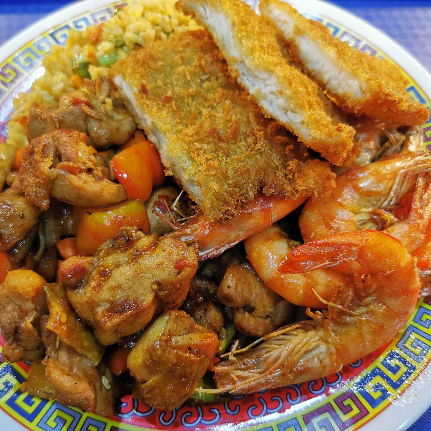 Arroz mixto o espaguetis, con pescado empanizado, pollo kang pao y camarón enchilado.