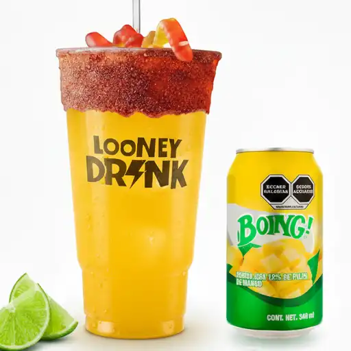 Boing de 355 ml preparado en un vaso escarchado, toque de limón y sal, acompañado de gomitas.
