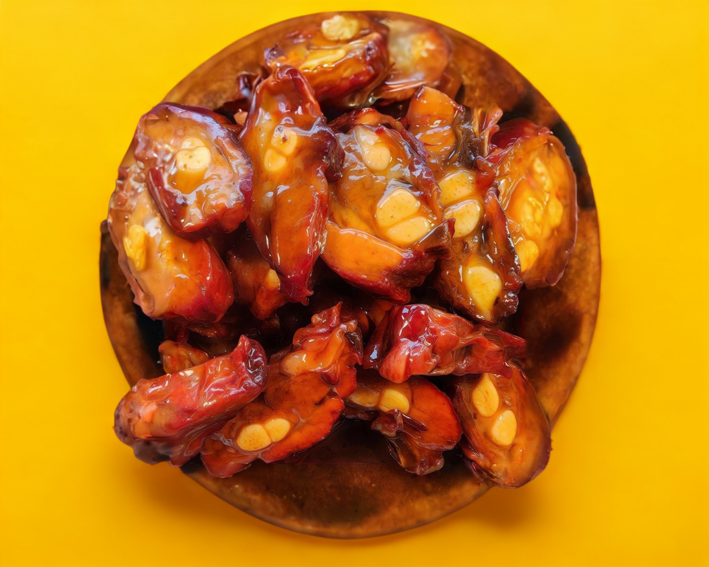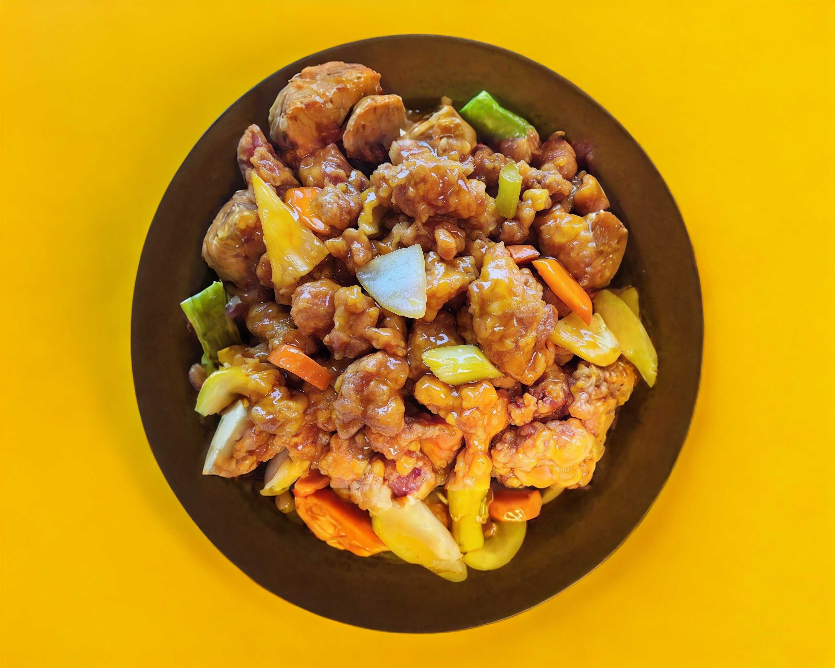 Trocitos de pollo capeados en salsa dulce con un toque acidito, ideal para una persona.
