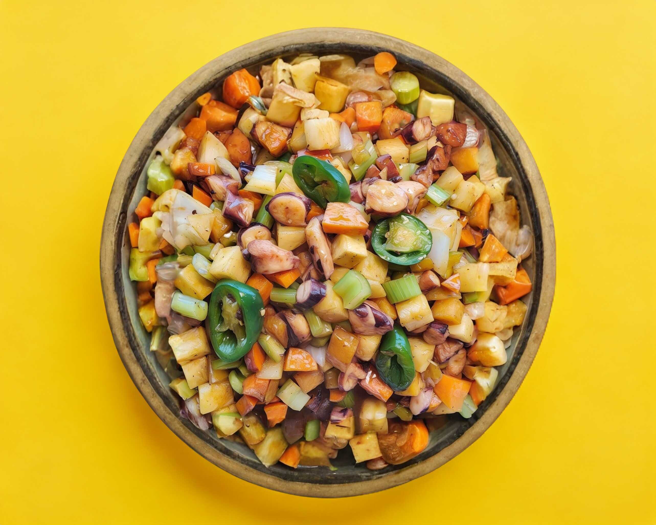 Salteado de vegetales y trocitos de pulpo, con un toque picoso