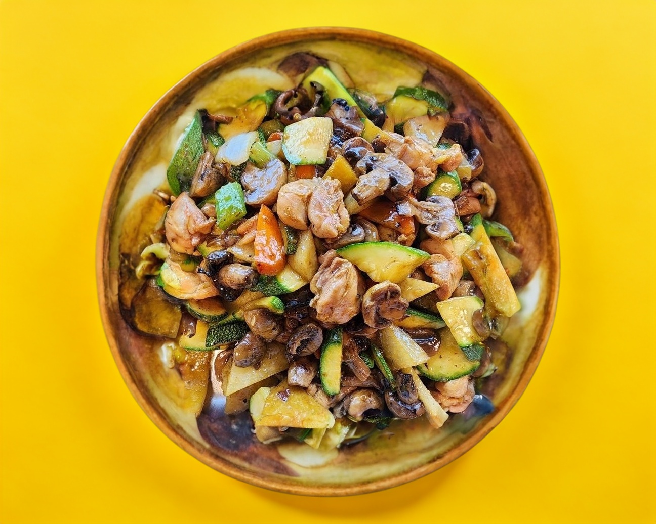 Salteado de champiñones, mezcla de vegetales con trocitos de pollo