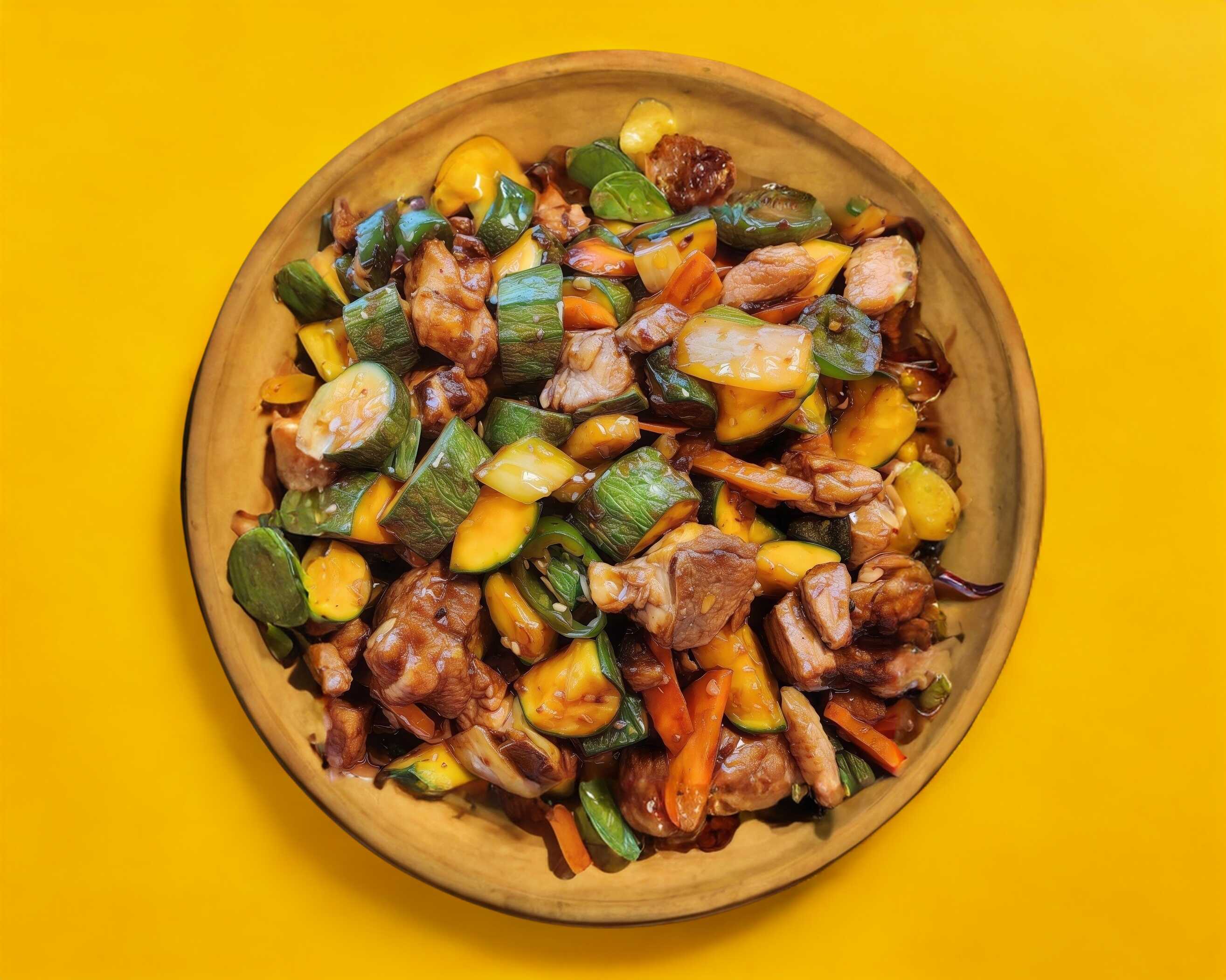 Salteado de láminas de cerdo con mezcla de vegetales, con un toque picoso