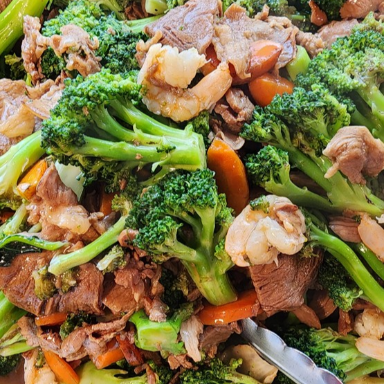 Trocitos de costilla con hueso salteados con vegetales en salsa estilo Cantón