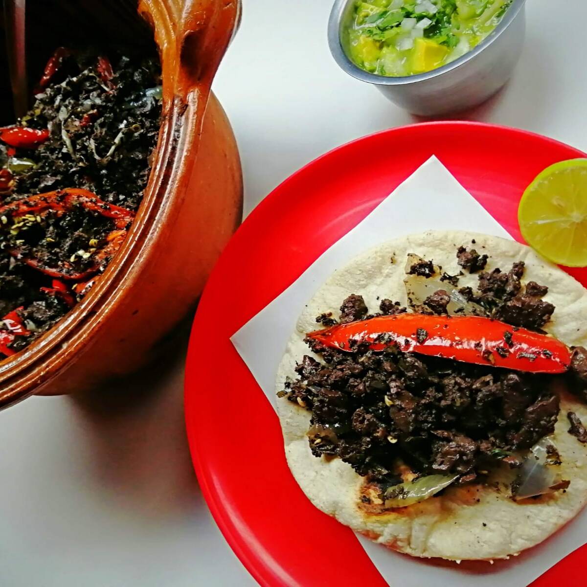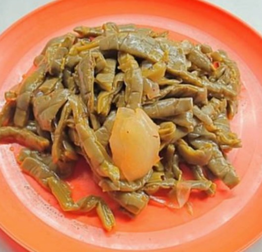 Sangre de borrego guisada con cebolla y rajas.