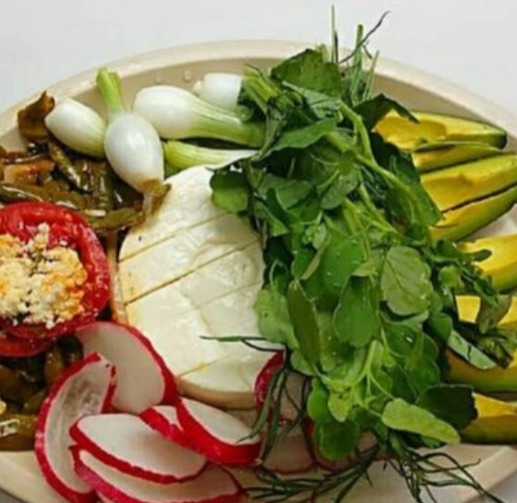 Queso tipo ranchero, nopales, aguacate, rábanos, pápalo y cebolla cambray. Porción para 4-5 personas.