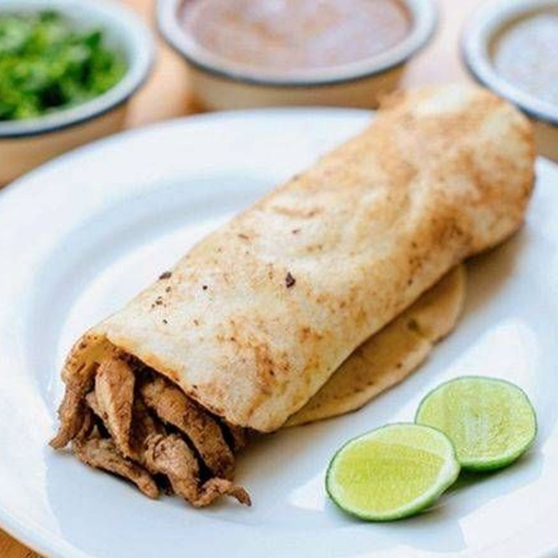 2 deliciosos tacos con tortilla de harina, queso y carne.
