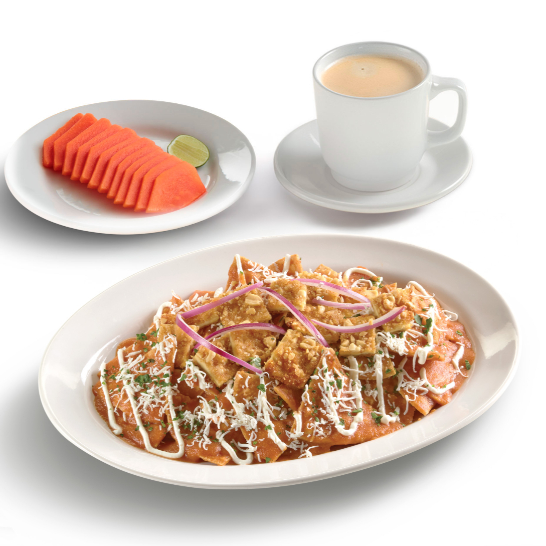 Chilaquiles en salsa de chile chipotle con piloncillo, acompañados de milanesa de pollo con cacahuate