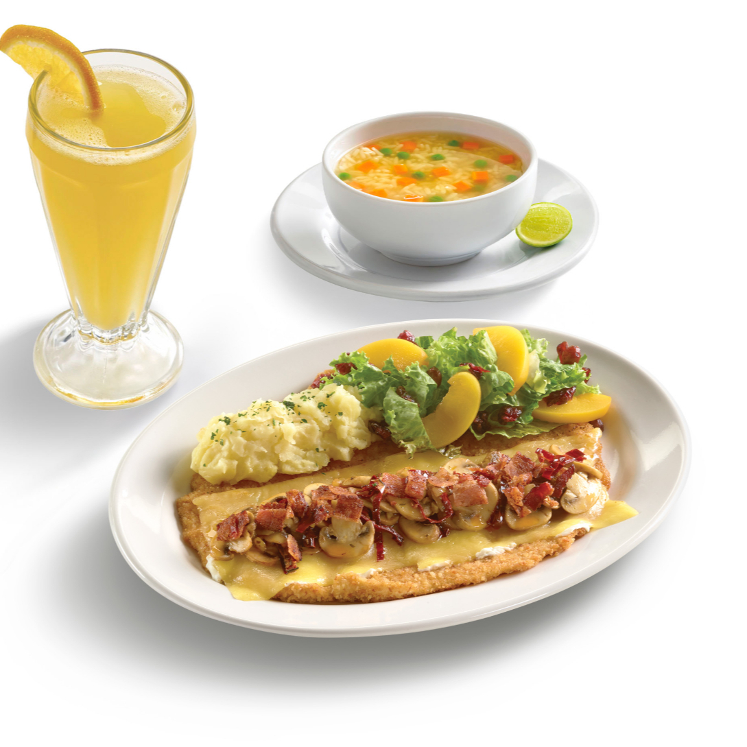 Milanesa de pollo gratinada con queso gouda y acompañada de champiñones al ajillo y ensalada mixta