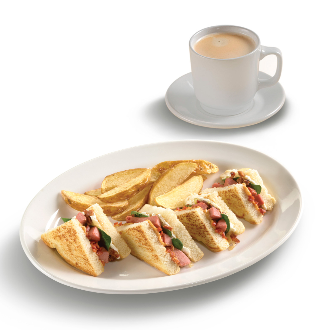 Club sándwich con salchicha, chorizo, queso crema, espinaca, tocino y cebolla caramelizada. Acompañado de papa gajo