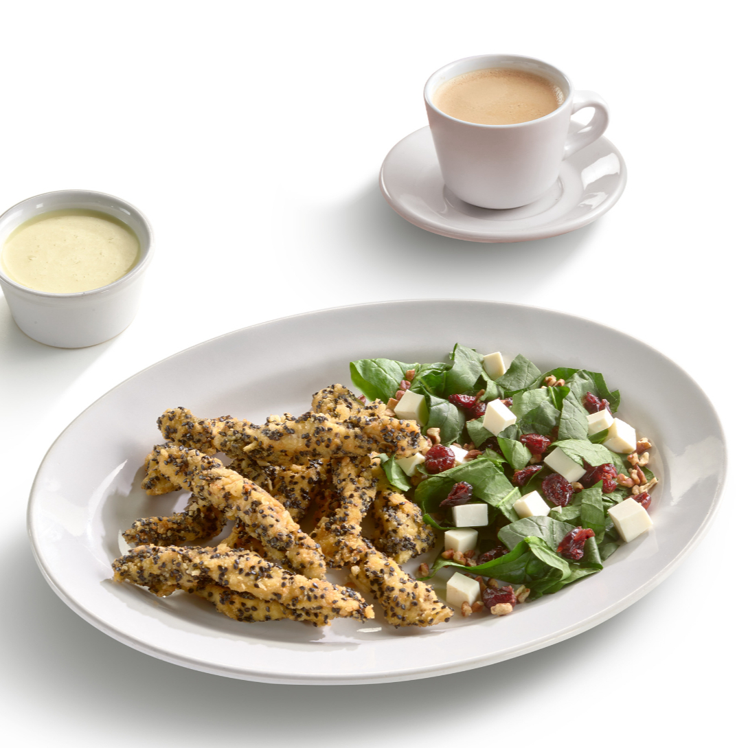 Tiras de pollo empanizadas con ajonjolí negro y aderezo miel mostaza. Acompañadas de ensalada de espinaca con nuez, arándanos y queso panela.