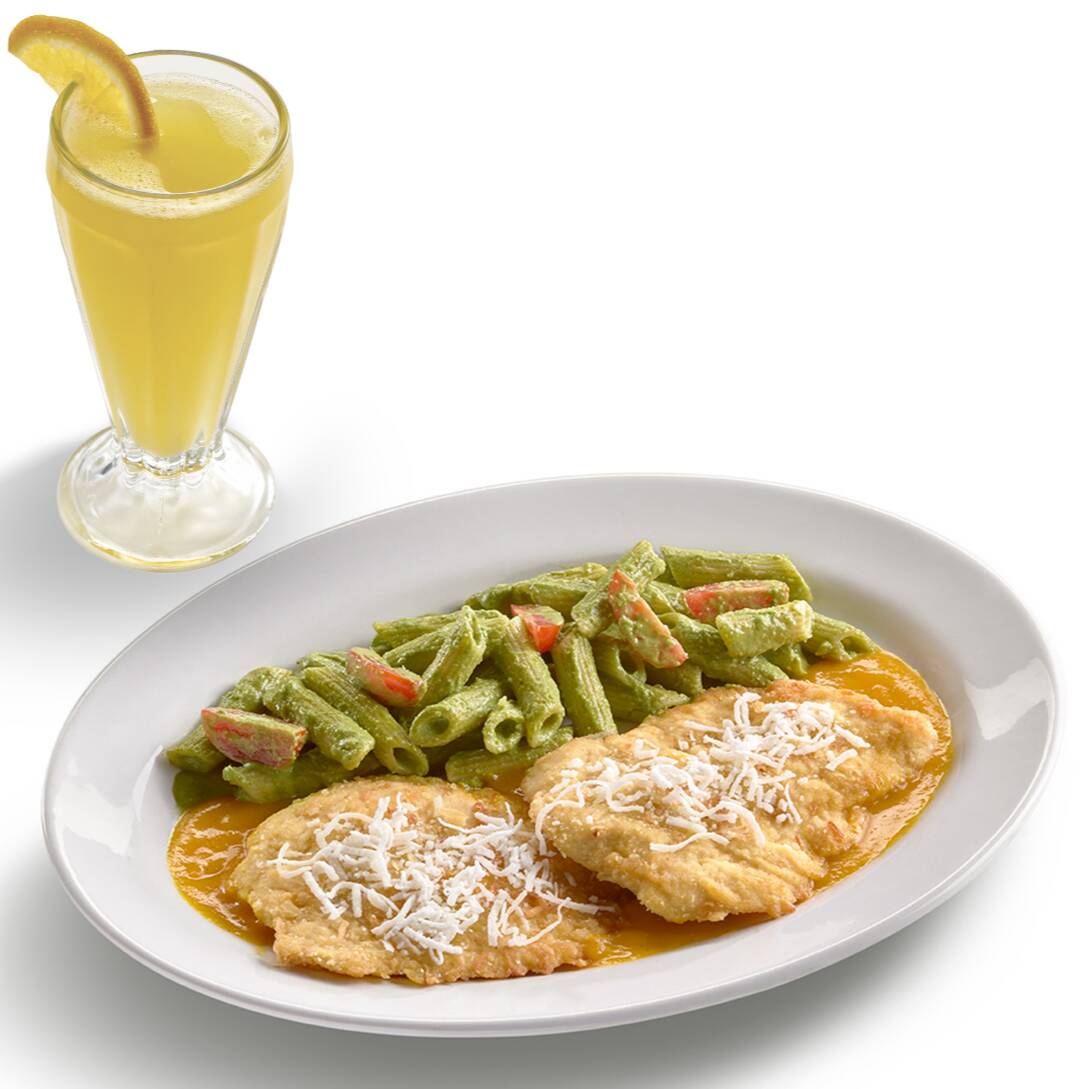 Sábana de pollo empanizada, acompañada de papas saratoga. Incluye consomé de pollo infantil 300 ml. Incluye 1 bolillo por platillo