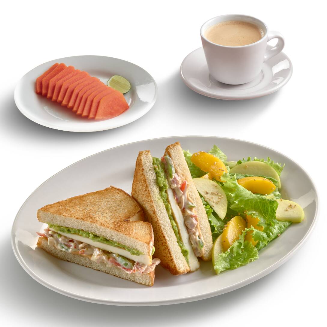Sándwich con mezcla de queso crema y pimientos con jamón, salchicha y queso panela frito. Acompañado de ensalada con durazno y manzana.