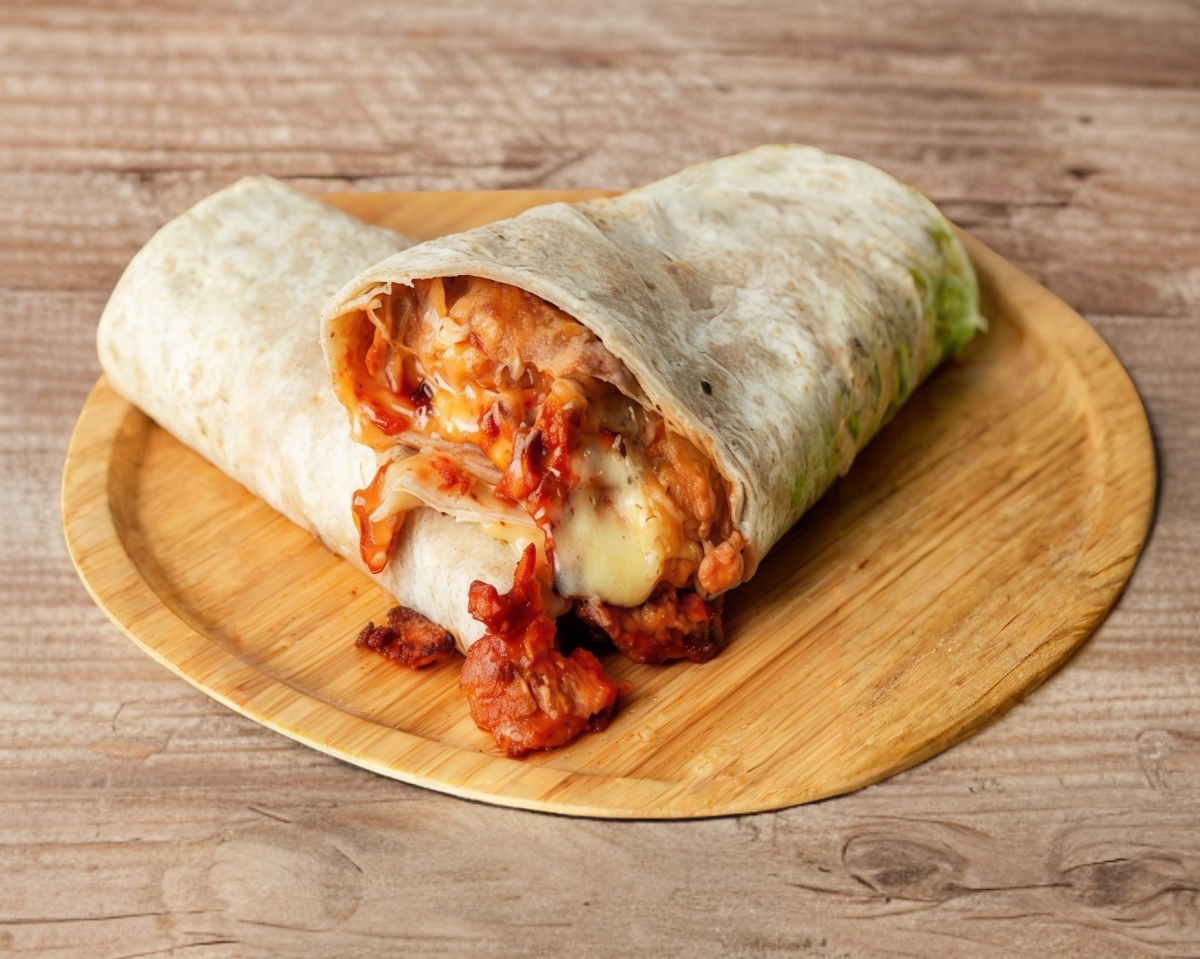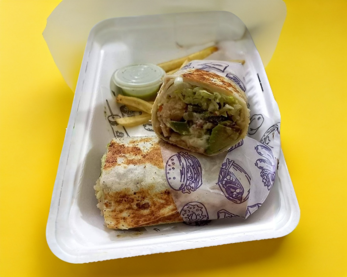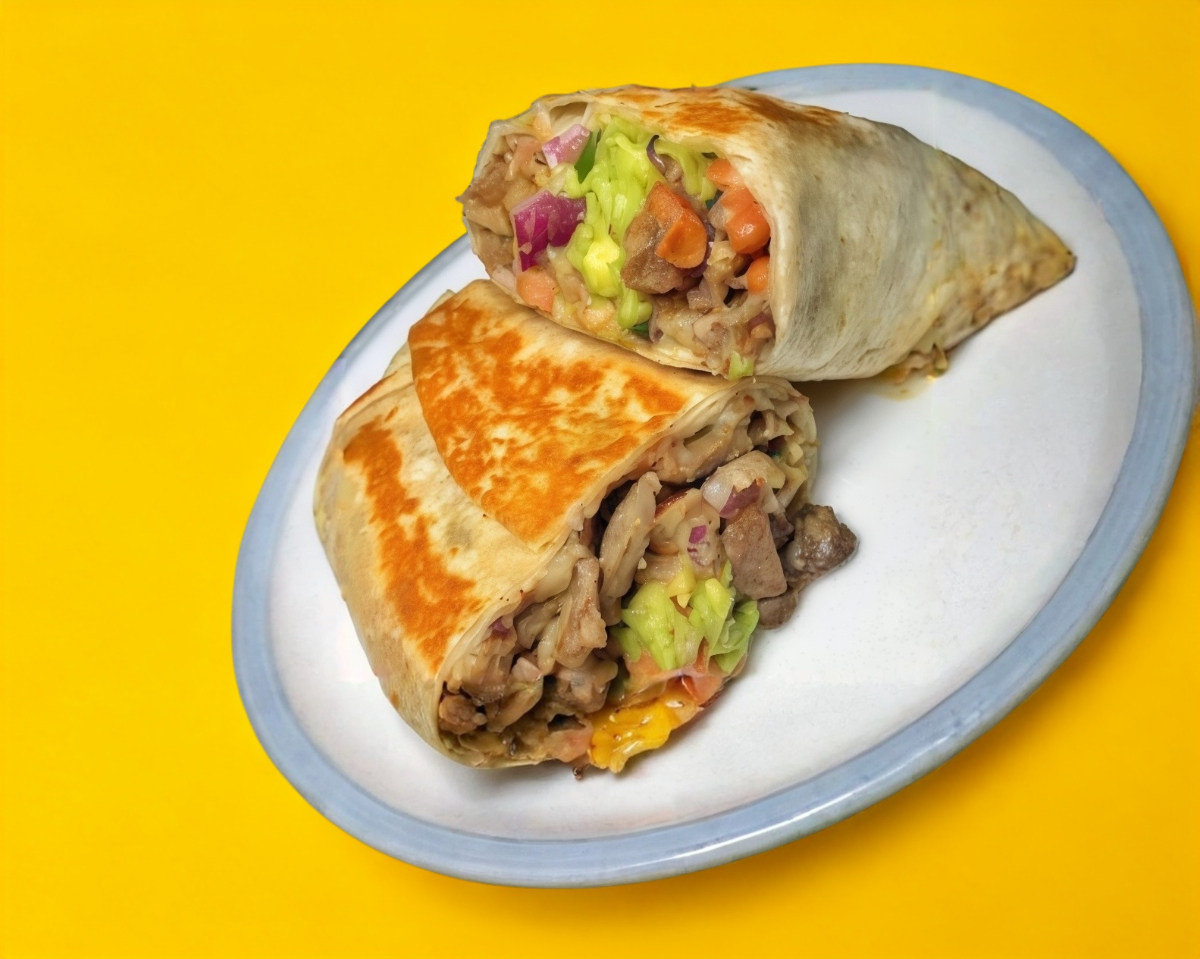 Tortilla de harina de 20 cm con pollo, bistec, longaniza, chile morrón, queso Oaxaca, arroz blanco, lechuga, cebolla, jitomate y un toque de aderezo de chipotle. Acompañado de papas fritas (270 g).